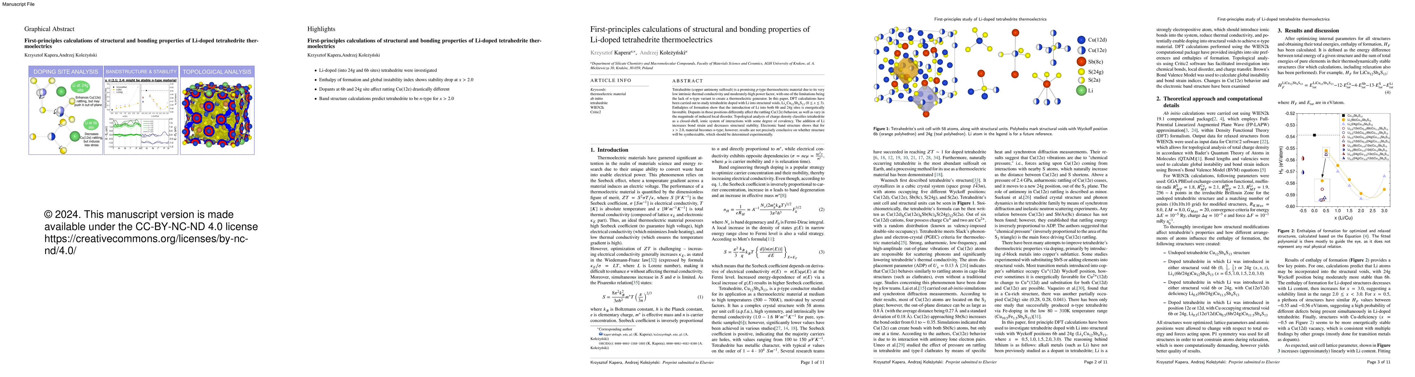 This paper uses DFT calculations to explore the structural and bonding effects of Li doping in tetrahedrite thermoelectrics, finding that Li introduction into 6b and 24g sites is energetically favorable and alters the Cu rattling behavior, while also increasing bond strain and potentially shifting the material to n-type for higher doping levels. Experimental synthesis remains necessary to confirm these findings.