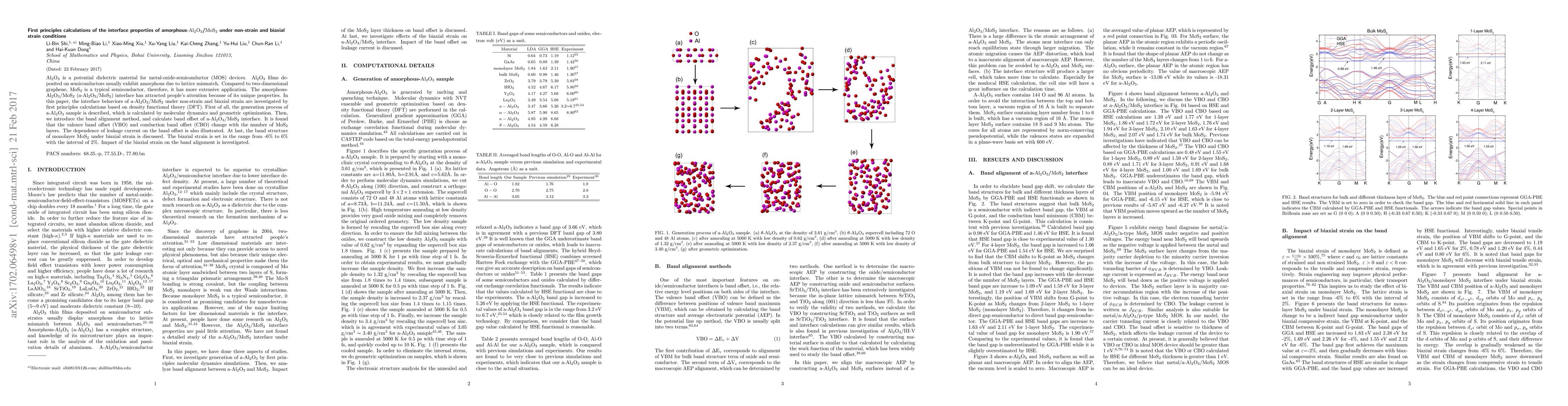 This paper investigates the interface properties of amorphous-Al2O3/MoS2 under non-strain and biaxial strain conditions using first principles calculations based on DFT. It finds that the band offsets vary with the number of MoS2 layers and that biaxial strain significantly impacts the band alignment.
