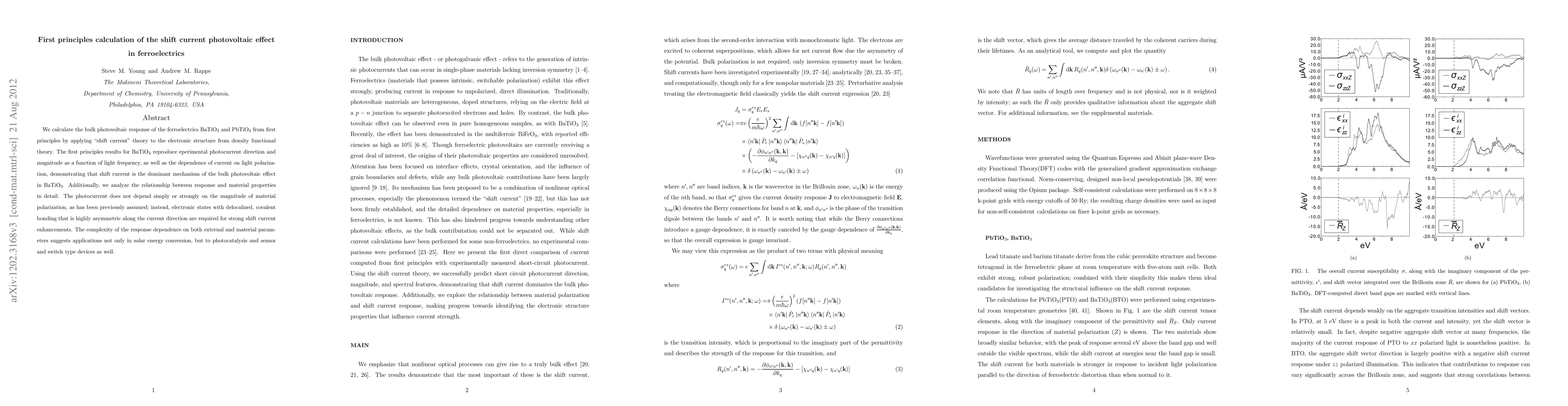 We calculate the bulk photovoltaic response of the ferroelectrics BaTiO$_3$ and PbTiO$_3$ from first principles by applying "shift current" theory to the electronic structure from density functional theory. The first principles results for BaTiO$_3$ reproduce eperimental photocurrent direction and magnitude as a function of light frequency, as well as the dependence of current on light polarization, demonstrating that shift current is the dominant mechanism of the bulk photovoltaic effect in BaTiO$_3$. Additionally, we analyze the relationship between response and material properties in detail. The photocurrent does not depend simply or strongly on the magnitude of material polarization, as has been previously assumed; instead, electronic states with delocalized, covalent bonding that is highly asymmetric along the current direction are required for strong shift current enhancements. The complexity of the response dependence on both external and material parameters suggests applications not only in solar energy conversion, but to photocatalysis and sensor and switch type devices as well.