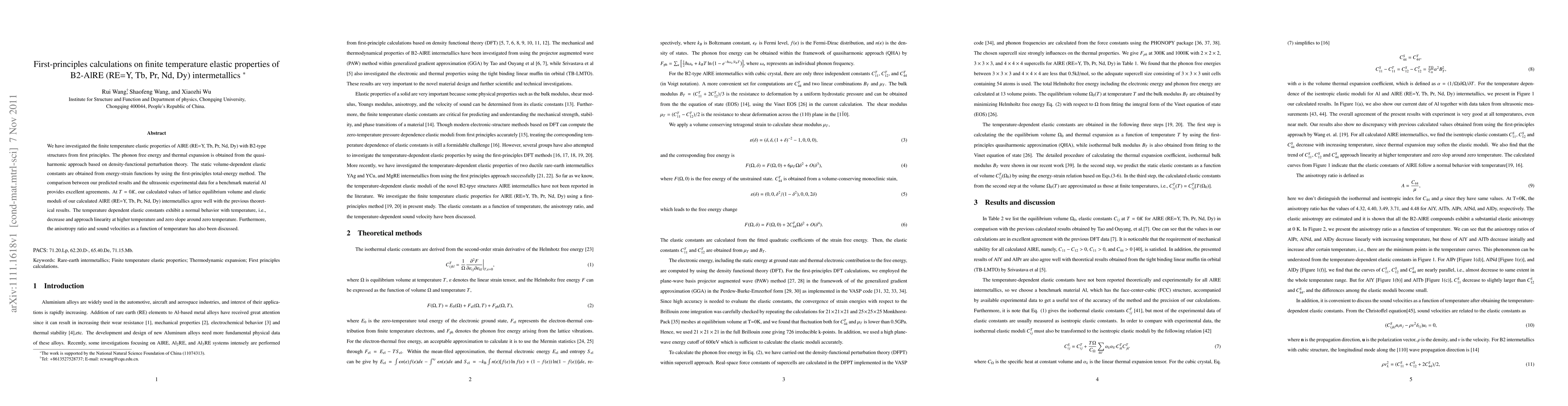 This paper investigates the finite temperature elastic properties of B2-type AlRE (RE=Y, Tb, Pr, Nd, Dy) intermetallics using first-principles calculations. The study finds good agreement between predicted elastic constants and experimental data, and observes normal temperature-dependent behavior in elastic constants, anisotropy, and sound velocities.