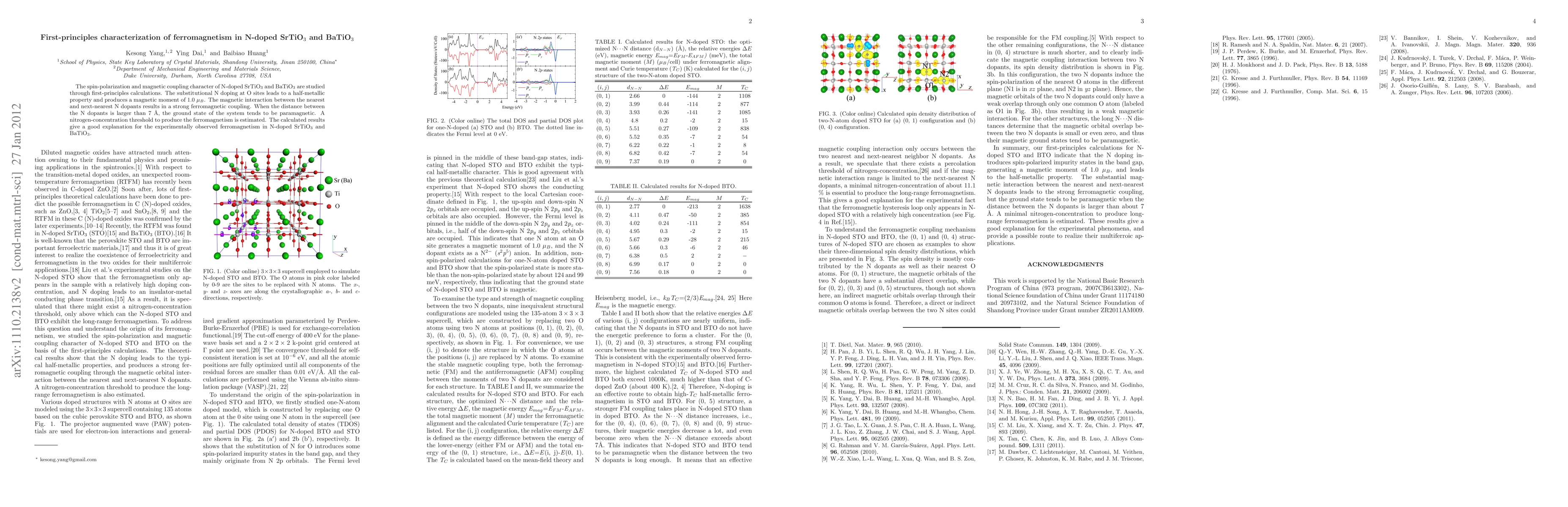 This study uses first-principles calculations to investigate ferromagnetism in N-doped SrTiO3 and BaTiO3, finding that N doping at O sites induces half-metallic properties and strong ferromagnetic coupling due to magnetic interactions between N dopants. A nitrogen concentration threshold is identified for sustained ferromagnetism.
