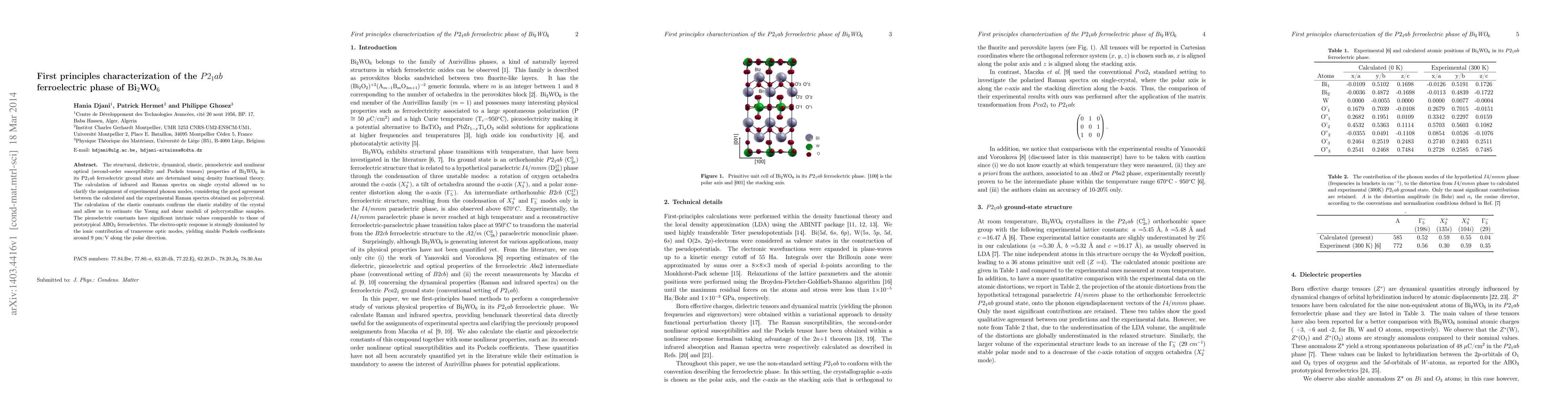 The structural, dielectric, dynamical, elastic, piezoelectric and nonlinear optical (second-order susceptibility and Pockels tensors) properties of Bi2$WO6 in its P2_1ab ferroelectric ground state are determined using density functional theory. The calculation of infrared and Raman spectra on single crystal allowed us to clarify the assignment of experimental phonon modes, considering the good agreement between the calculated and the experimental Raman spectra obtained on polycrystal. The calculation of the elastic constants confirms the elastic stability of the crystal and allow us to estimate the Young and shear moduli of polycrystalline samples. The piezoelectric constants have significant intrinsic values comparable to those of prototypical ABO3 ferroelectrics. The electro-optic response is strongly dominated by the ionic contribution of transverse optic modes, yielding sizable Pockels coefficients around 9 pm/V along the polar direction.