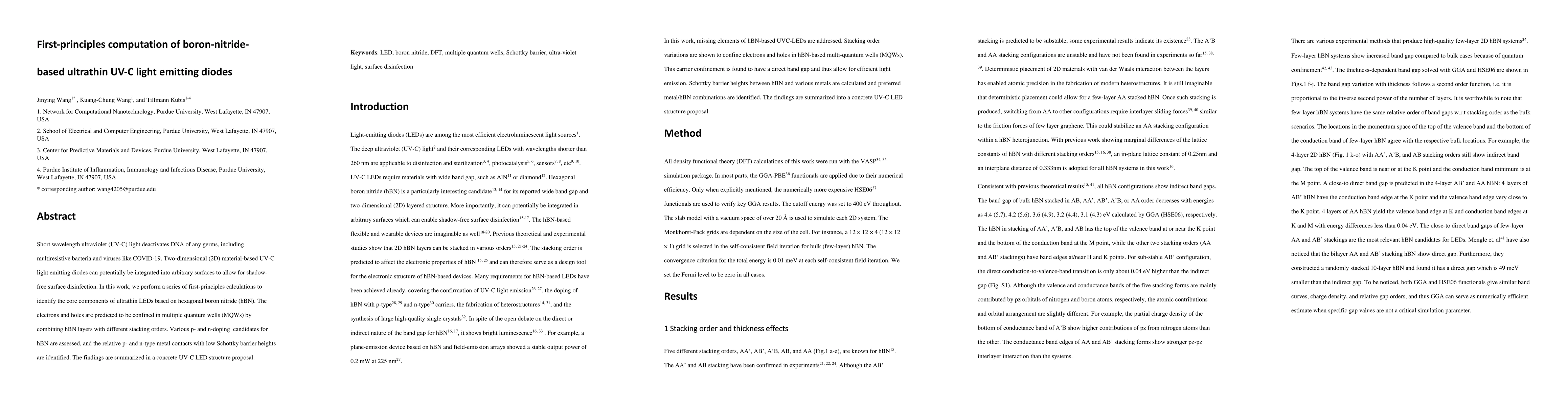 Short wavelength ultraviolet (UV-C) light deactivates DNA of any germs, including multiresistive bacteria and viruses like COVID-19. Two-dimensional (2D) material-based UV-C light emitting diodes can potentially be integrated into arbitrary surfaces to allow for shadow-free surface disinfection. In this work, we perform a series of first-principles calculations to identify the core components of ultrathin LEDs based on hexagonal boron nitride (hBN). The electrons and holes are predicted to be confined in multiple quantum wells (MQWs) by combining hBN layers with different stacking orders. Various p- and n-doping candidates for hBN are assessed, and the relative p- and n-type metal contacts with low Schottky barrier heights are identified. The findings are summarized in a concrete UV-C LED structure proposal.