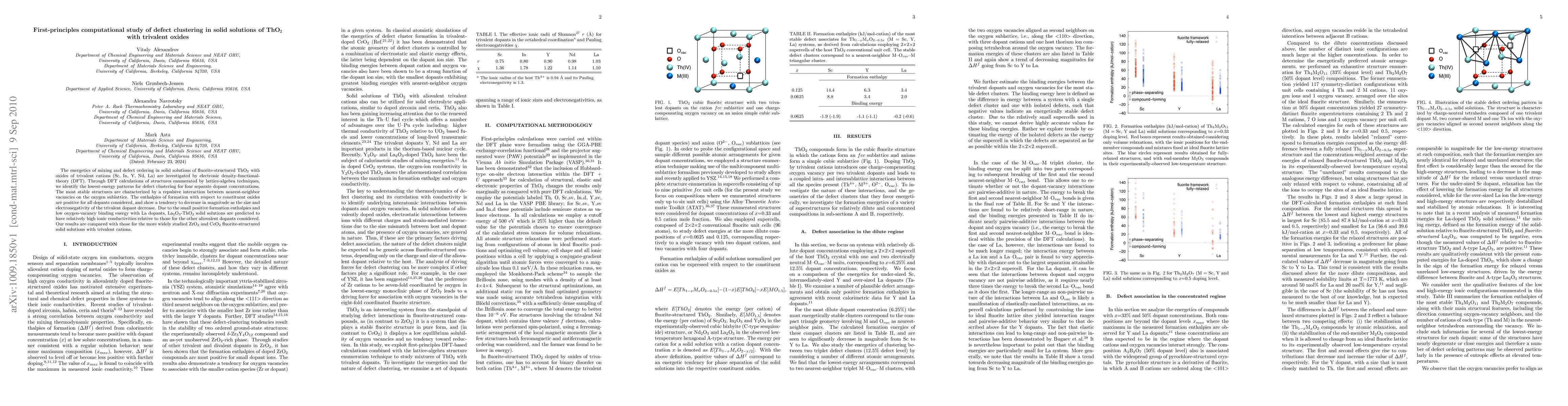 The energetics of mixing and defect ordering in solid solutions of fluorite-structured ThO$_{2}$ with oxides of trivalent cations (Sc, In, Y, Nd, La) are investigated by electronic density-functional-theory (DFT). Through DFT calculations of structures enumerated by lattice-algebra techniques, we identify the lowest-energy patterns for defect clustering for four separate dopant concentrations. The most stable structures are characterized by a repulsive interaction between nearest-neighbor vacancies on the oxygen sublattice. The enthalpies of formation with respect to constituent oxides are positive for all dopants considered, and show a tendency to decrease in magnitude as the size and electronegativity of the trivalent dopant decrease. Due to the small positive formation enthalpies and low oxygen-vacancy binding energy with La dopants, La$_{2}$O$_{3}$-ThO$_{2}$ solid solutions are predicted to have relatively high ionic conductivities relative to those for the other aliovalent dopants considered. Our results are compared with those for the more widely studied ZrO$_{2}$ and CeO$_{2}$ fluorite-structured solid solutions with trivalent cations.