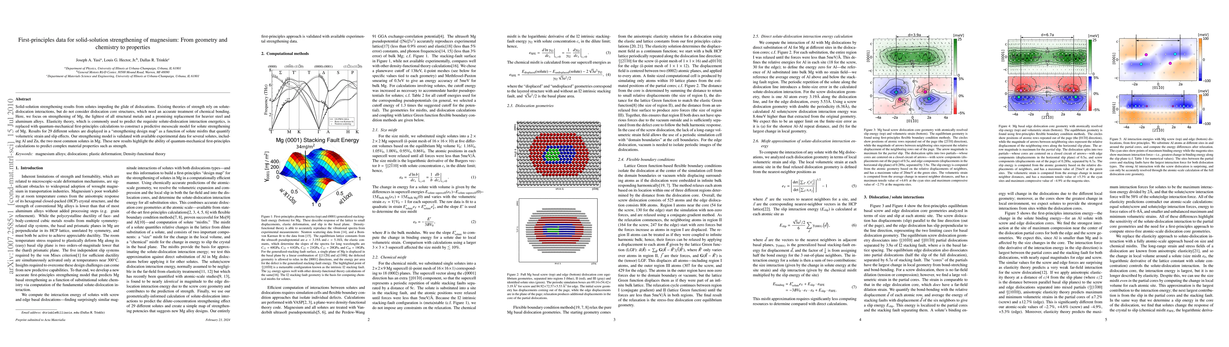 Solid-solution strengthening results from solutes impeding the glide of dislocations. Existing theories of strength rely on solute-dislocation interactions, but do not consider dislocation core structures, which need an accurate treatment of chemical bonding. Here, we focus on strengthening of Mg, the lightest of all structural metals and a promising replacement for heavier steel and aluminum alloys. Elasticity theory, which is commonly used to predict the requisite solute-dislocation interaction energetics, is replaced with quantum-mechanical first-principles calculations to construct a predictive mesoscale model for solute strengthening of Mg. Results for 29 different solutes are displayed in a "strengthening design map" as a function of solute misfits that quantify volumetric strain and slip effects. Our strengthening model is validated with available experimental data for several solutes, including Al and Zn, the two most common solutes in Mg. These new results highlight the ability of quantum-mechanical first-principles calculations to predict complex material properties such as strength.