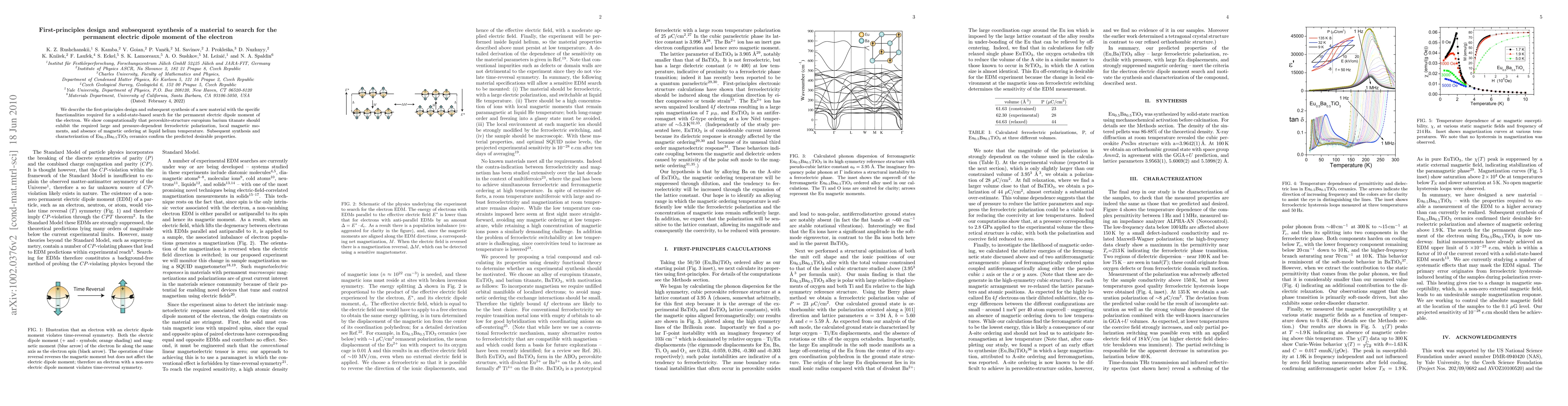 This paper details the first-principles design and synthesis of europium barium titanate, a perovskite material, for a solid-state search of the permanent electric dipole moment of the electron. Computational predictions and experimental synthesis confirm the material's large ferroelectric polarization and absence of magnetic ordering.