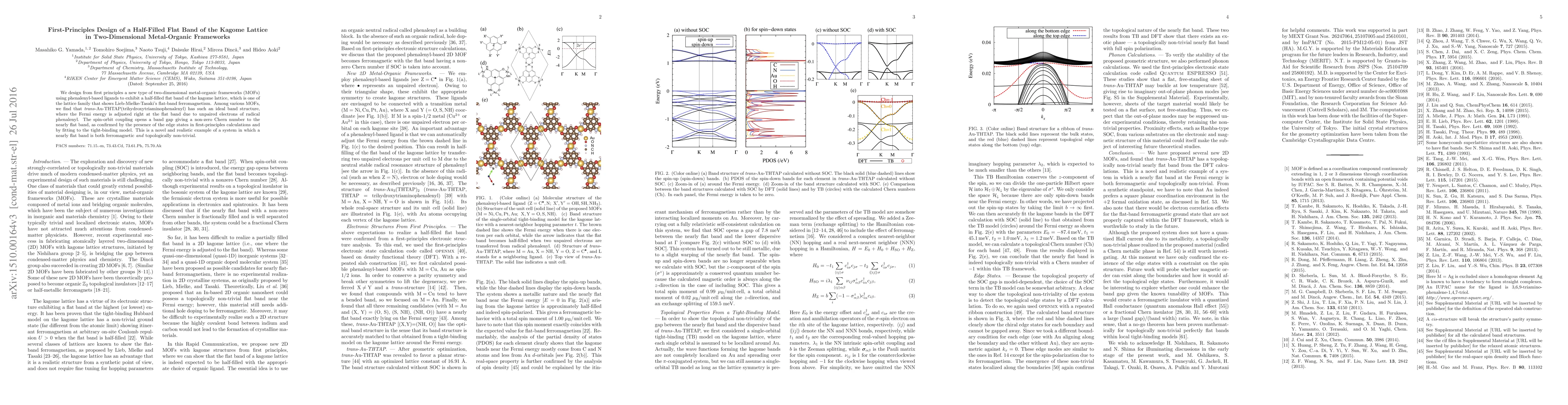 This paper presents a first-principles design of a two-dimensional metal-organic framework with a half-filled flat band in a kagome lattice, specifically $\textit{trans}$-Au-THTAP, which exhibits ferromagnetic and topologically non-trivial properties due to spin-orbit coupling and unpaired electrons.