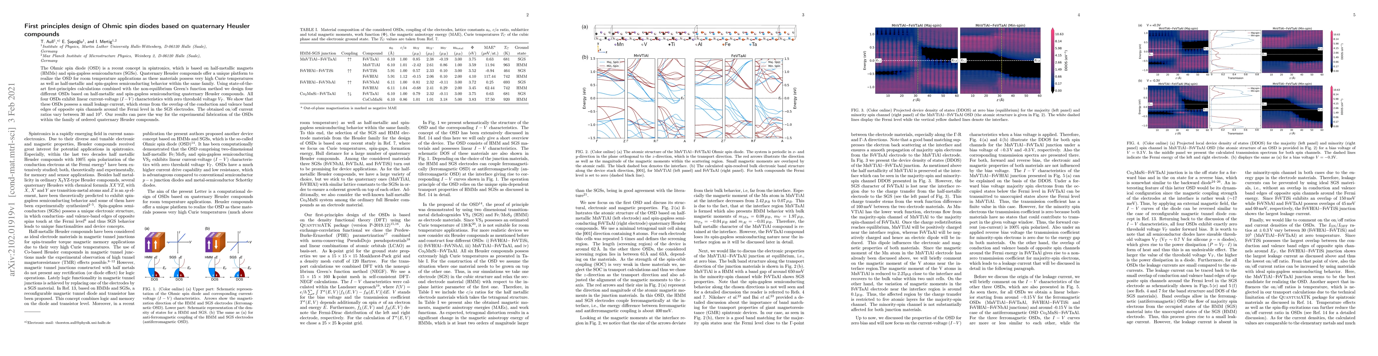 This paper presents the first principles design of Ohmic spin diodes (OSDs) using quaternary Heusler compounds, which combine half-metallic and spin-gapless semiconducting properties. The study reveals four OSDs with linear $I-V$ characteristics and on/off current ratios ranging from 30 to $10^5$, suggesting potential for room temperature spintronics applications.