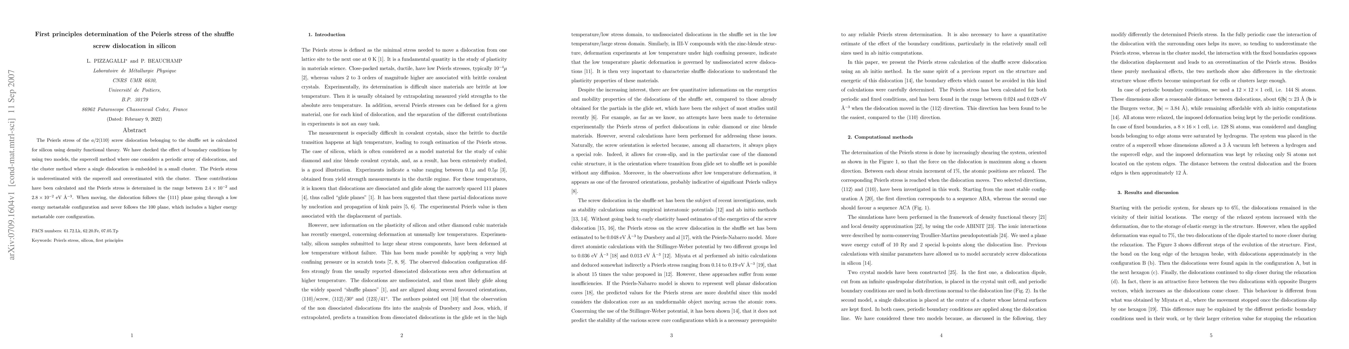 Researchers used density functional theory to calculate the Peierls stress of a specific dislocation in silicon, finding it to be between 2.4 x 10^-2 and 2.8 x 10^-2 eV { }^3.