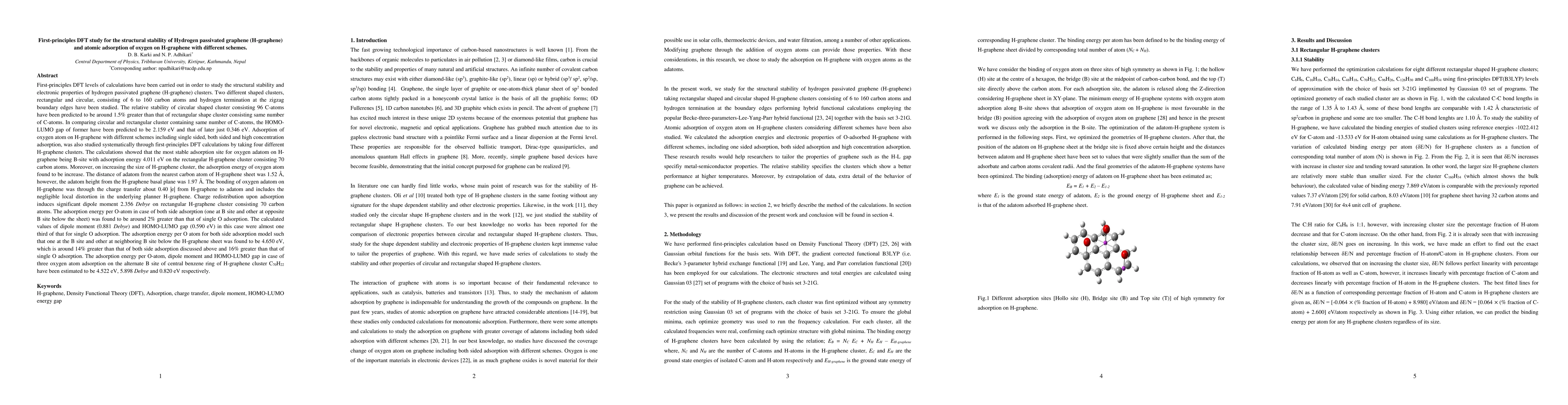 This research uses first-principles DFT calculations to investigate the structural stability and electronic properties of hydrogen-passivated graphene (H-graphene) clusters, finding that rectangular clusters are more stable than circular ones. Additionally, the study examines the adsorption of oxygen atoms on H-graphene under various configurations.