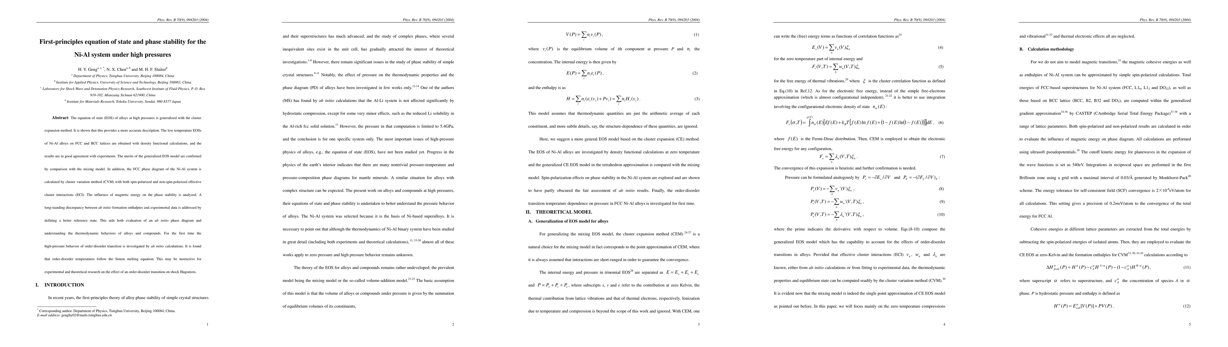 The equation of state (EOS) of alloys at high pressures is generalized with the cluster expansion method. It is shown that this provides a more accurate description. The low temperature EOSs of Ni-Al alloys on FCC and BCC lattices are obtained with density functional calculations, and the results are in good agreement with experiments. The merits of the generalized EOS model are confirmed by comparison with the mixing model. In addition, the FCC phase diagram of the Ni-Al system is calculated by cluster variation method (CVM) with both spin-polarized and non-spin-polarized effective cluster interactions (ECI). The influence of magnetic energy on the phase stability is analyzed. A long-standing discrepancy between ab initio formation enthalpies and experimental data is addressed by defining a better reference state. This aids both evaluation of an ab initio phase diagram and understanding the thermodynamic behaviors of alloys and compounds. For the first time the high-pressure behavior of order-disorder transition is investigated by ab initio calculations. It is found that order-disorder temperatures follow the Simon melting equation. This may be instructive for experimental and theoretical research on the effect of an order-disorder transition on shock Hugoniots.