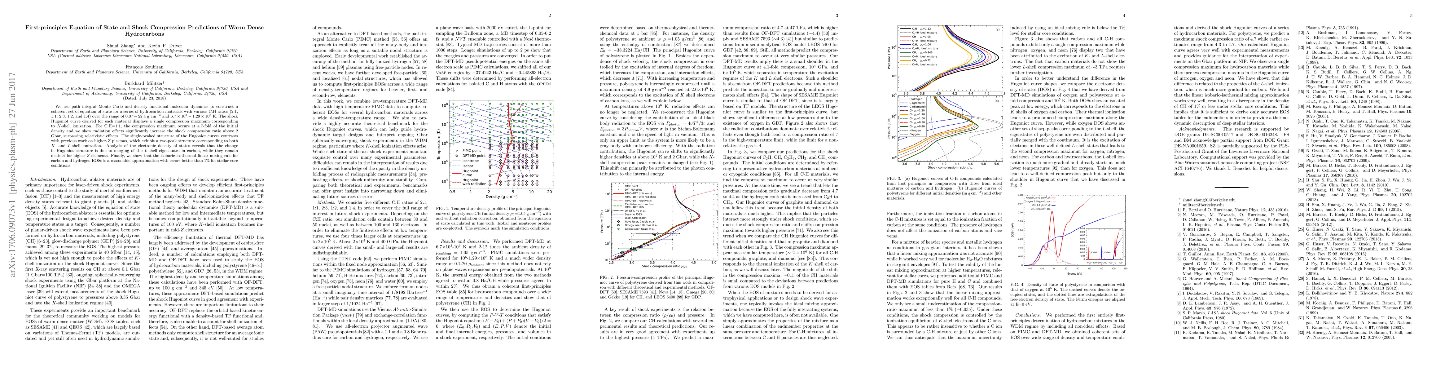 We use path integral Monte Carlo and density functional molecular dynamics to construct a coherent set of equation of state for a series of hydrocarbon materials with various C:H ratios (2:1, 1:1, 2:3, 1:2, and 1:4) over the range of $0.07-22.4$ g/cm$^{3}$ and $6.7\times10^3-1.29\times10^8$ K. The shock Hugoniot curve derived for each material displays a single compression maximum corresponding to $K$-shell ionization. For C:H=1:1, the compression maximum occurs at 4.7-fold of the initial density and we show radiation effects significantly increase the shock compression ratio above 2 Gbar, surpassing relativistic effects. The single-peaked structure of the Hugoniot curves contrasts with previous work on higher-$Z$ plasmas, which exhibit a two-peak structure corresponding to both $K$- and $L$-shell ionization. Analysis of the electronic density of states reveals that the change in Hugoniot structure is due to merging of the $L$-shell eigenstates in carbon, while they remain distinct for higher-$Z$ elements. Finally, we show that the isobaric-isothermal linear mixing rule for carbon and hydrogen EOSs is a reasonable approximation with errors better than 1% for stellar-core conditions.