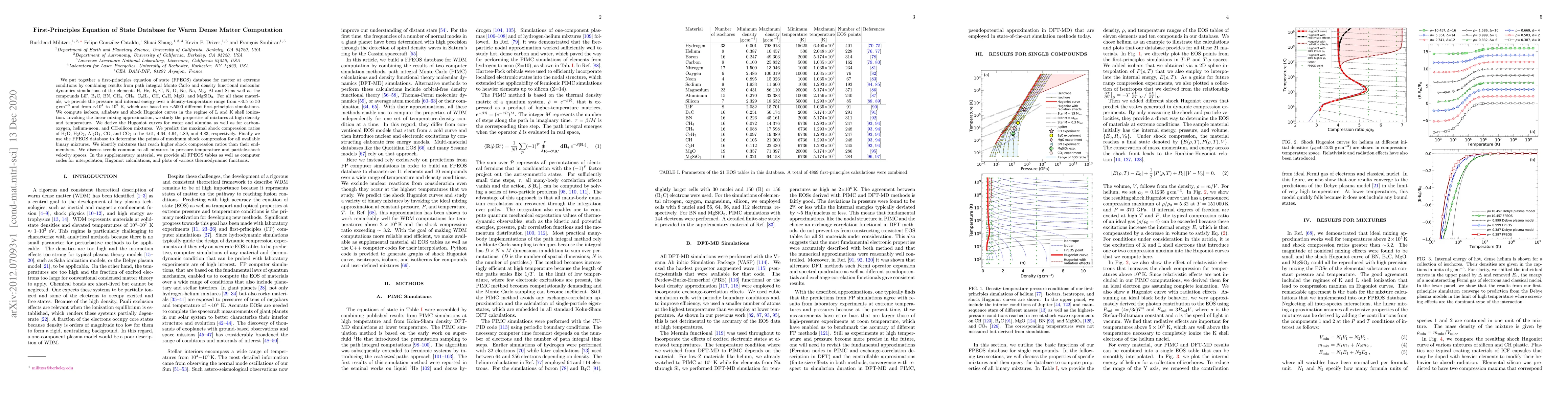 This research compiles a comprehensive first-principles equation of state (FPEOS) database for warm dense matter, combining simulations of elements and compounds over a wide density-temperature range. The study identifies maximal shock compression ratios for various substances and mixtures, revealing trends in thermodynamic properties and identifying mixtures with higher shock compression ratios.