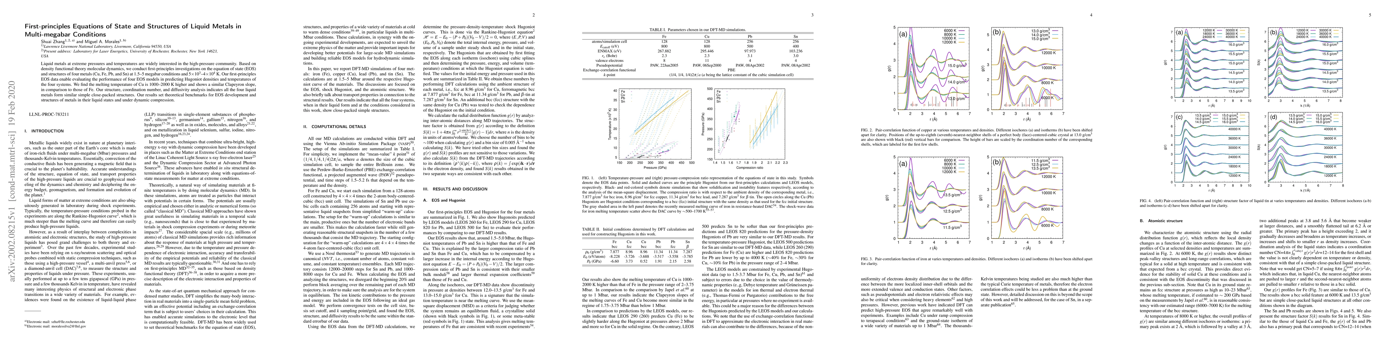 This paper uses density functional theory to investigate the equations of state and structures of liquid Cu, Fe, Pb, and Sn under extreme pressures (1.5--5 megabars) and temperatures (5$\times10^3$--4$\times10^4$ K). The study reveals that the melting temperature of Cu is significantly higher than that of Fe, while all four metals exhibit similar simple close-packed structures under dynamic compression.