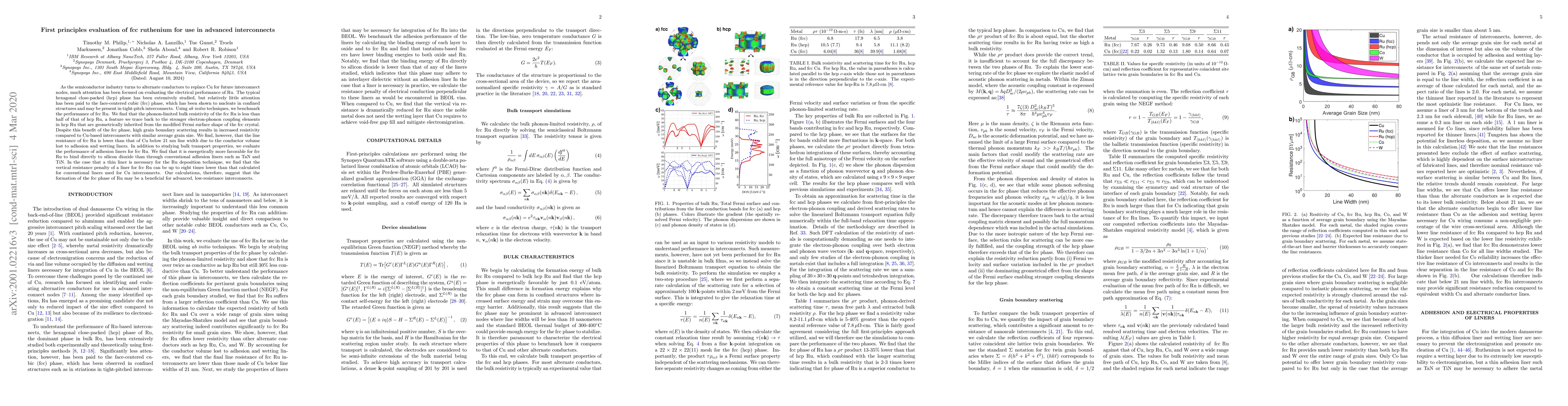 As the semiconductor industry turns to alternate conductors to replace Cu for future interconnect nodes, much attention as been focused on evaluating the electrical performance of Ru. The typical hexagonal close-packed (hcp) phase has been extensively studied, but relatively little attention has been paid to the face-centered cubic (fcc) phase, which has been shown to nucleate in confined structures and may be present in tight-pitch interconnects. Using \emph{ab initio} techniques, we benchmark the performance of fcc Ru. We find that the phonon-limited bulk resistivity of the fcc Ru is less than half of that of hcp Ru, a feature we trace back to the stronger electron-phonon coupling elements that are geometrically inherited from the modified Fermi surface shape of the fcc crystal. Despite this benefit of the fcc phase, high grain boundary scattering results in increased resistivity compared to Cu-based interconnects with similar average grain size. We find, however, that the line resistance of fcc Ru is lower than that of Cu below 21 nm line width due to the conductor volume lost to adhesion and wetting liners. In addition to studying bulk transport properties, we evaluate the performance of adhesion liners for fcc Ru. We find that it is energetically more favorable for fcc Ru to bind directly to silicon dioxide than through conventional adhesion liners such as TaN and TiN. In the case that a thin liner is necessary for the Ru deposition technique, we find that the vertical resistance penalty of a liner for fcc Ru can be up to eight times lower than that calculated for conventional liners used for Cu interconnects. Our calculations, therefore, suggest that the formation of the fcc phase of Ru may be a beneficial for advanced, low-resistance interconnects.
