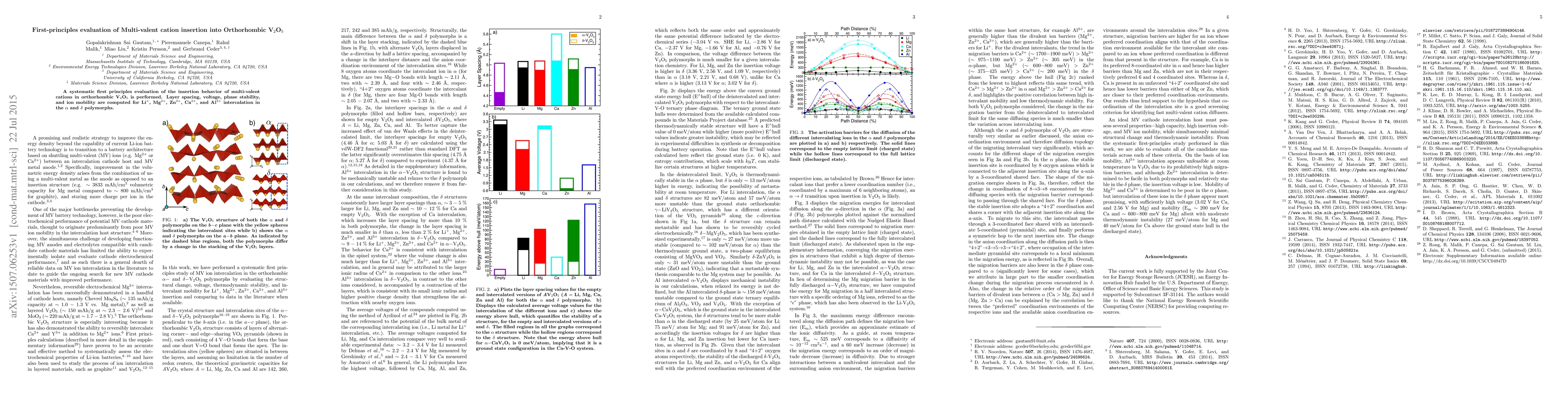 A systematic first principles evaluation of the insertion behavior of multi-valent cations in orthorhombic V$_2$O$_5$ is performed. Layer spacing, voltage, phase stability, and ion mobility are computed for Li$^+$, Mg$^{2+}$, Zn$^{2+}$, Ca$^{2+}$, and Al$^{3+}$ intercalation in the $\alpha$ and $\delta$ polymorphs.