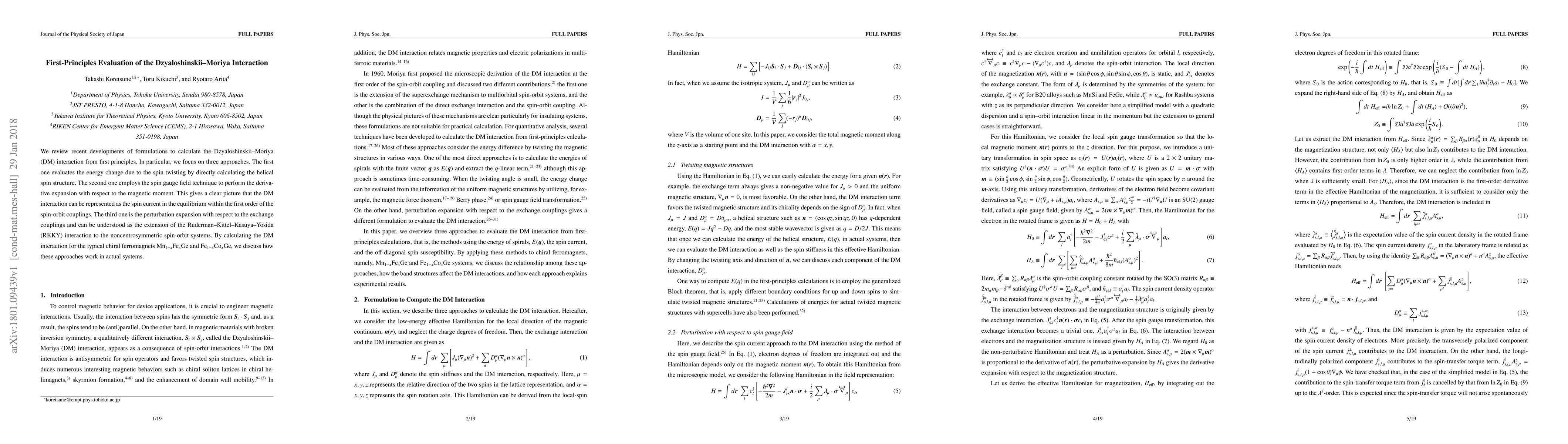 We review recent developments of formulations to calculate the Dzyaloshinskii--Moriya (DM) interaction from first principles. In particular, we focus on three approaches. The first one evaluates the energy change due to the spin twisting by directly calculating the helical spin structure. The second one employs the spin gauge field technique to perform the derivative expansion with respect to the magnetic moment. This gives a clear picture that the DM interaction can be represented as the spin current in the equilibrium within the first order of the spin-orbit couplings. The third one is the perturbation expansion with respect to the exchange couplings and can be understood as the extension of the Ruderman--Kittel--Kasuya--Yosida (RKKY) interaction to the noncentrosymmetric spin-orbit systems. By calculating the DM interaction for the typical chiral ferromagnets Mn$_{1-x}$Fe$_x$Ge and Fe$_{1-x}$Co$_x$Ge, we discuss how these approaches work in actual systems.