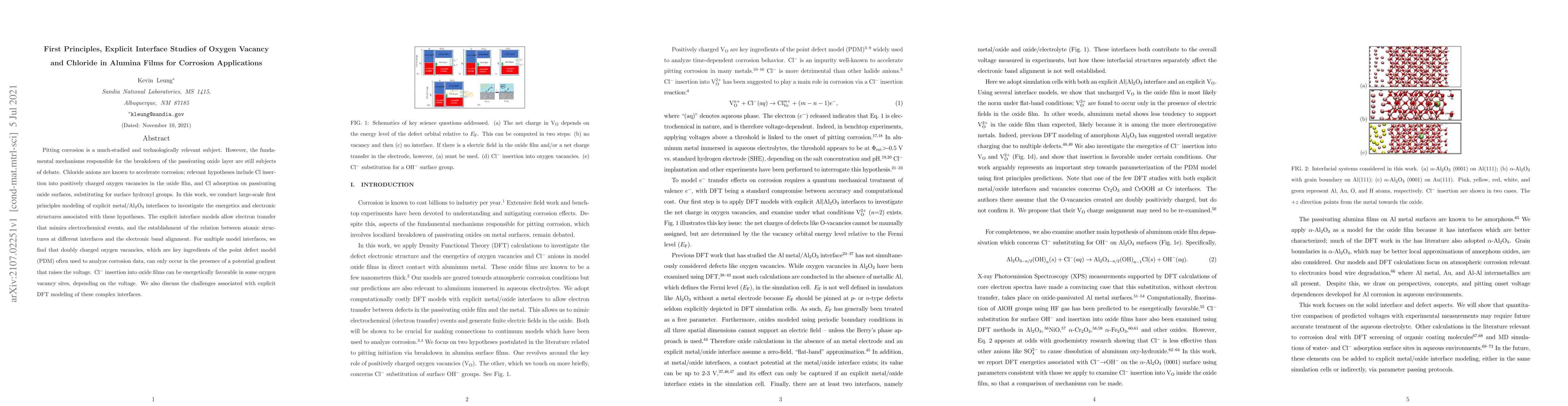Pitting corrosion is a much-studied and technologically relevant subject. However, the fundamental mechanisms responsible for the breakdown of the passivating oxide layer are still subjects of debate. Chloride anions are known to accelerate corrosion; relevant hypotheses include Cl insertion into positively charged oxygen vacancies in the oxide film, and Cl adsorption on passivating oxide surfaces, substituting for surface hydroxyl groups. In this work, we conduct large-scale first principles modeling of explicit metal/Al(2)O(3) interfaces to investigate the energetics and electronic structures associated with these hypotheses. The explicit interface models allow electron transfer that mimics electrochemical events, and the establishment of the relation between atomic structures at different interfaces and the electronic band alignment. For multiple model interfaces, we find that doubly charged oxygen vacancies, which are key ingredients of the point defect model (PDM) often used to analyze corrosion data, can only occur in the presence of a potential gradient that raises the voltage. Cl-insertion into oxide films can be energetically favorable in some oxygen vacancy sites, depending on the voltage. We also discuss the challenges associated with explicit DFT modeling of these complex interfaces.