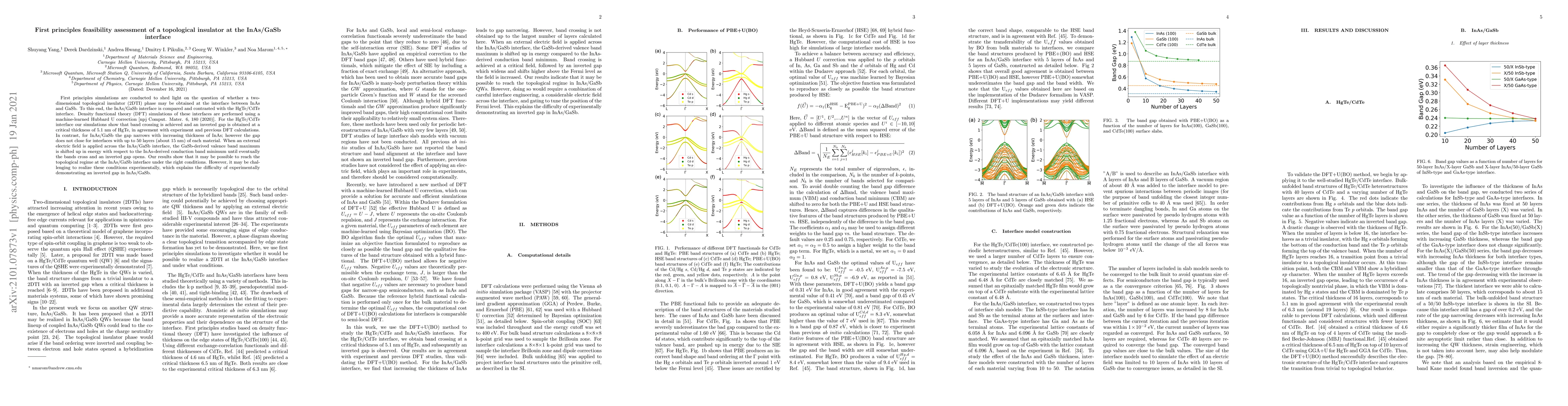 First principles simulations are conducted to shed light on the question of whether a two-dimensional topological insulator (2DTI) phase may be obtained at the interface between InAs and GaSb. To this end, the InAs/GaSb interface is compared and contrasted with the HgTe/CdTe interface. Density functional theory (DFT) simulations of these interfaces are performed using a machine-learned Hubbard U correction [npj Comput. Mater. 6, 180 (2020)]. For the HgTe/CdTe interface our simulations show that band crossing is achieved and an inverted gap is obtained at a critical thickness of 5.1 nm of HgTe, in agreement with experiment and previous DFT calculations. In contrast, for InAs/GaSb the gap narrows with increasing thickness of InAs; however the gap does not close for interfaces with up to 50 layers (about 15 nm) of each material. When an external electric field is applied across the InAs/GaSb interface, the GaSb-derived valence band maximum is shifted up in energy with respect to the InAs-derived conduction band minimum until eventually the bands cross and an inverted gap opens. Our results show that it may be possible to reach the topological regime at the InAs/GaSb interface under the right conditions. However, it may be challenging to realize these conditions experimentally, which explains the difficulty of experimentally demonstrating an inverted gap in InAs/GaSb.