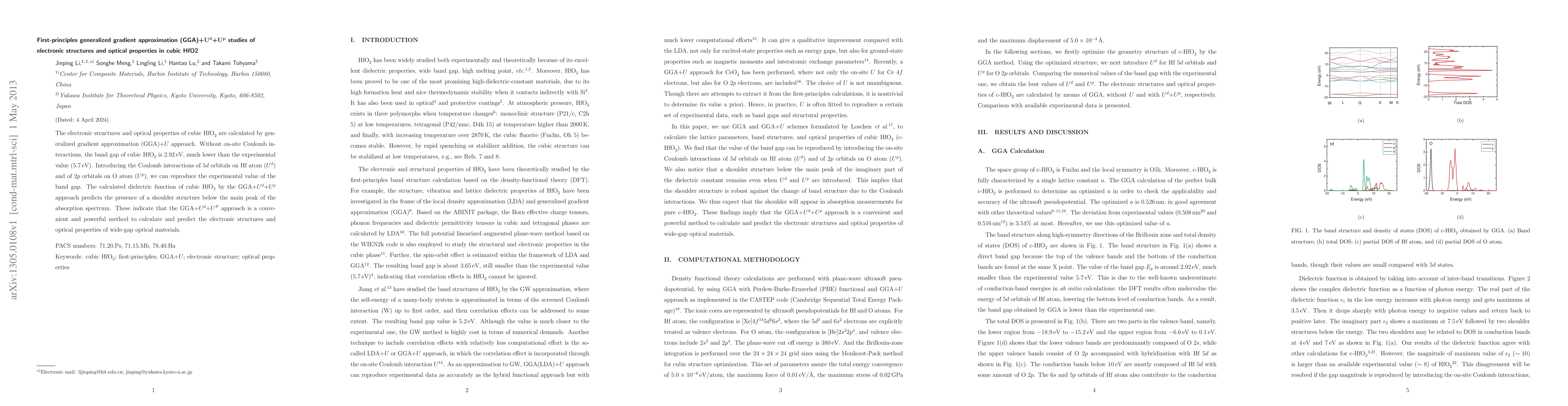 This study uses GGA+Ud+Up to calculate the electronic structures and optical properties of cubic HfO2, showing that the band gap matches experimental values when on-site Coulomb interactions are included, and predicts a shoulder structure in the absorption spectrum.