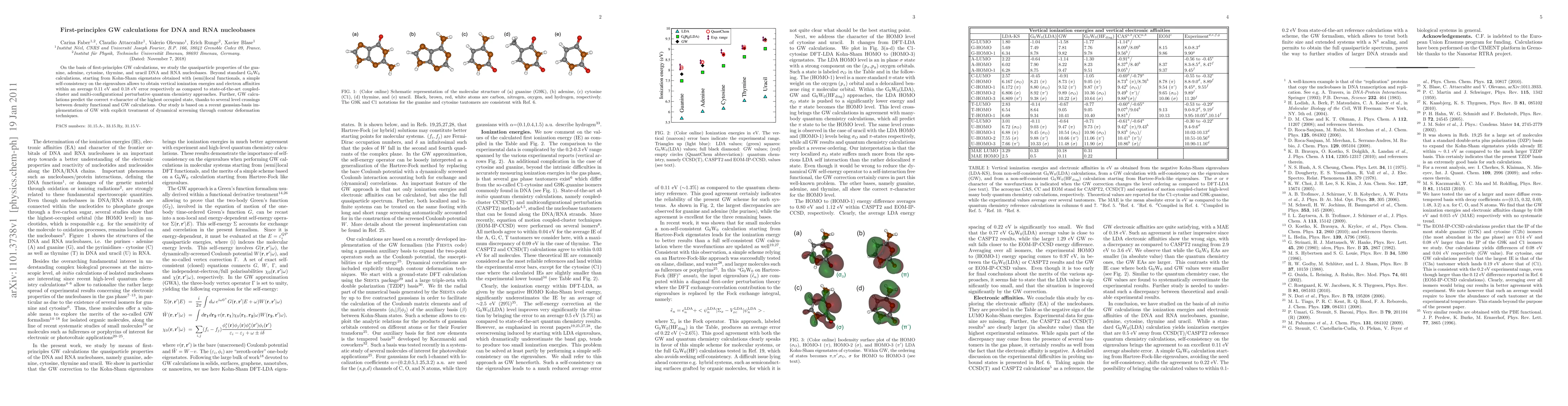 This paper uses first-principles GW calculations to investigate the quasiparticle properties of DNA and RNA nucleobases, achieving accurate vertical ionization energies and electron affinities. The study highlights the correct π-character of the highest occupied state and employs a gaussian-basis implementation of GW for dynamical screening.