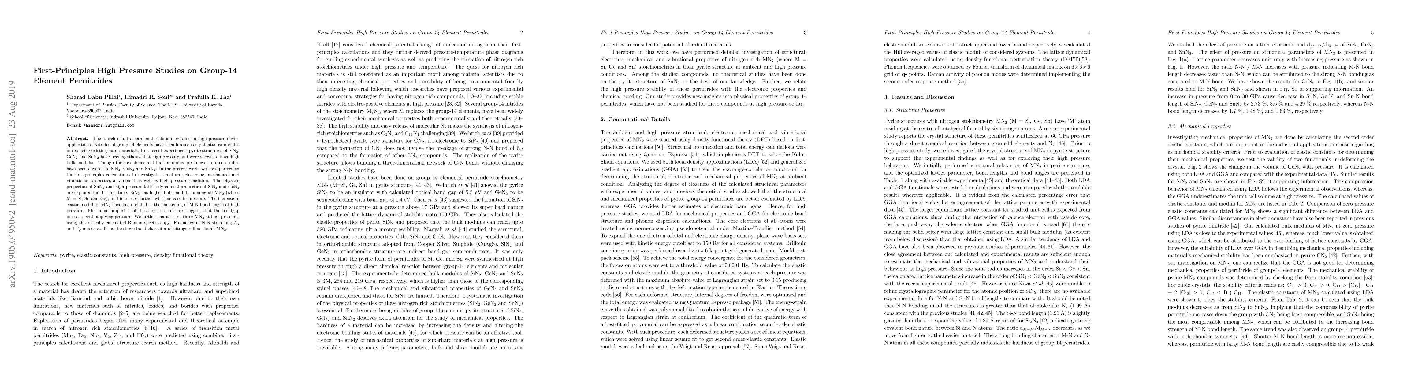 The search for ultra hard materials is inevitable in high pressure device applications. Nitrides of group-14 elements have been foreseen as potential candidates in replacing existing hard materials. In a recent experiment, pyrite structures of SiN2, GeN2 and SnN2 have been synthesized at high pressure and were shown to have high bulk modulus. Though their existence and bulk modulus are known, limited studies have been devoted to SiN2, GeN2 and SnN2. In the present work, we perform first-principles calculations to investigate structural, electronic, mechanical and vibrational properties at ambient as well as high pressure condition. The physical properties of SnN2 and high pressure lattice dynamical properties of SiN2 and GeN2 are explored for the first time. SiN2 has higher bulk modulus among all MN2 (where M = Si, Sn and Ge), and increases further with increase in pressure. The increase in elastic moduli of MN2 have been related to the shortening of M-N bond length at high pressures. Electronic properties of these pyrite structures suggest that the bandgap increases with applying pressure. We further characterize these MN2 compounds at high pressures using theoretically calculated Raman spectroscopy. Frequency of N-N stretching Ag and Tg modes confirms the single bond character of nitrogen dimer in all MN2.