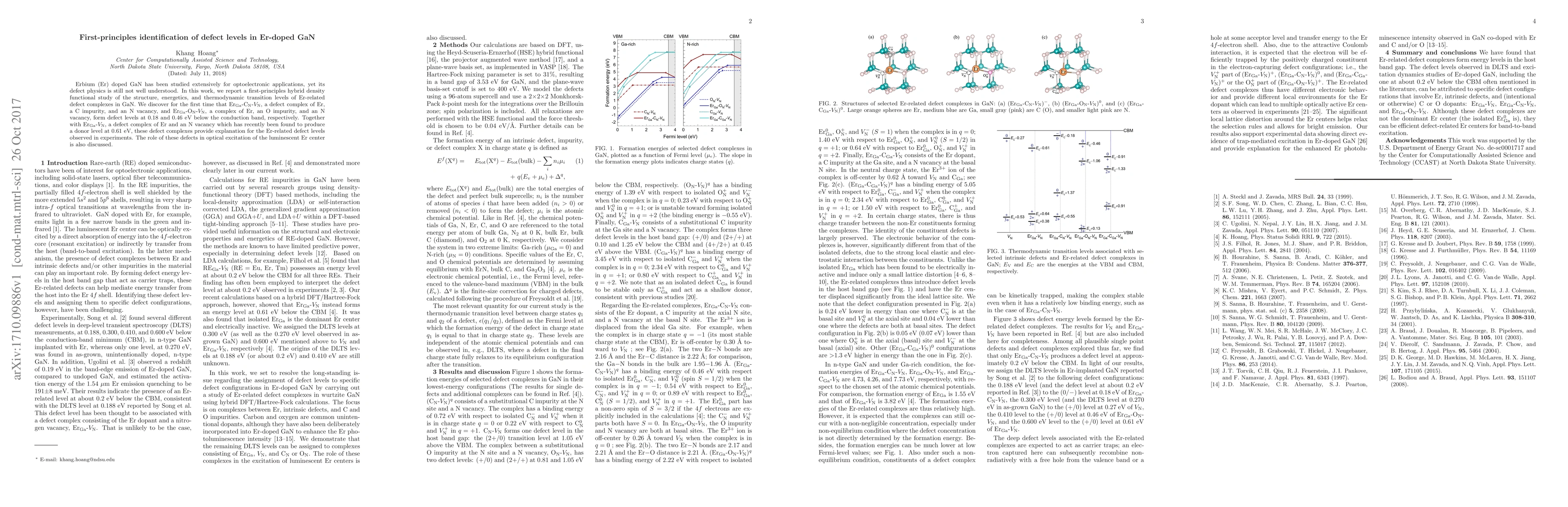 This study uses first-principles hybrid density functional theory to identify defect levels in Er-doped GaN, revealing Er-related defect complexes that form levels at 0.18 and 0.46 eV below the conduction band, providing insight into the material's optoelectronic properties.