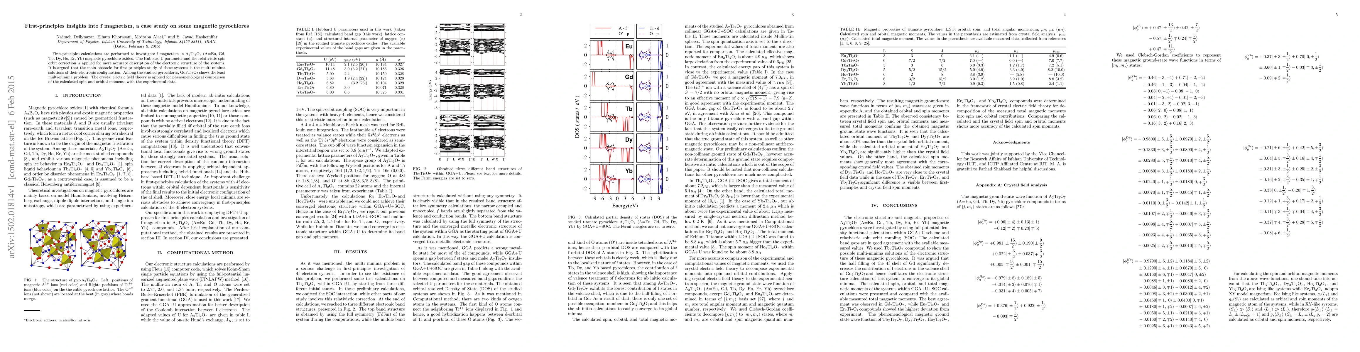 This paper uses first-principles calculations to explore f magnetism in various magnetic pyrochlore oxides, focusing on the role of the Hubbard U parameter and relativistic spin-orbit correction. Gd$_2$Ti$_2$O$_7$ is found to have the least multi-minima problem, and the crystal electric field theory is used to compare calculated spin and orbital moments with experimental data.