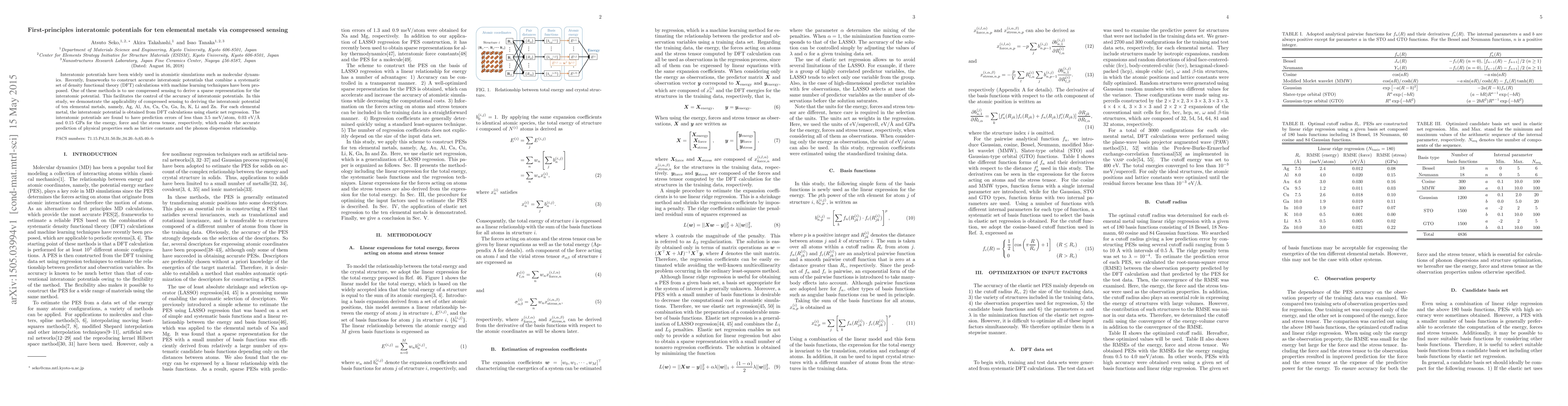 This study employs compressed sensing and elastic net regression to derive accurate interatomic potentials for ten elemental metals from density functional theory calculations. The resulting potentials exhibit low prediction errors, enabling precise simulations of physical properties.