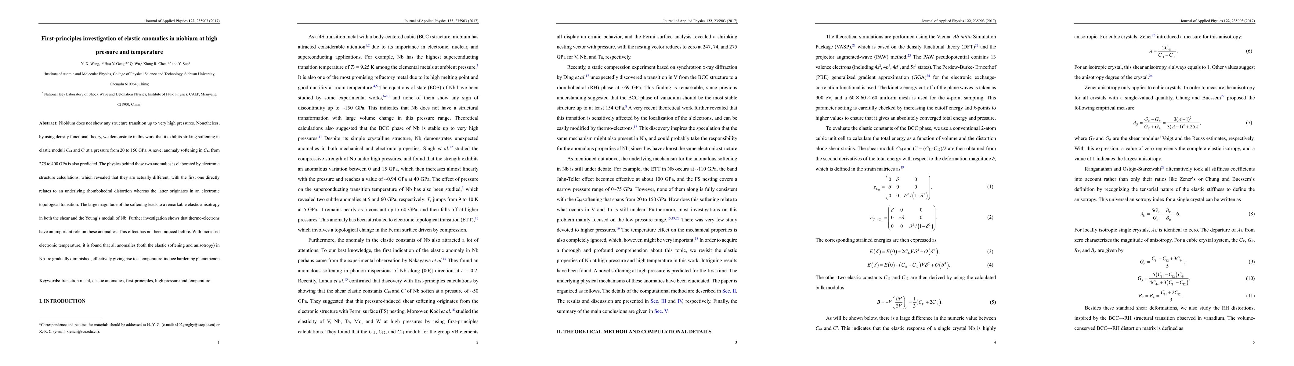 Researchers discovered two types of anomalies in niobium's elastic properties under high pressure and temperature, with one related to a rhombohedral distortion and the other to an electronic topological transition.