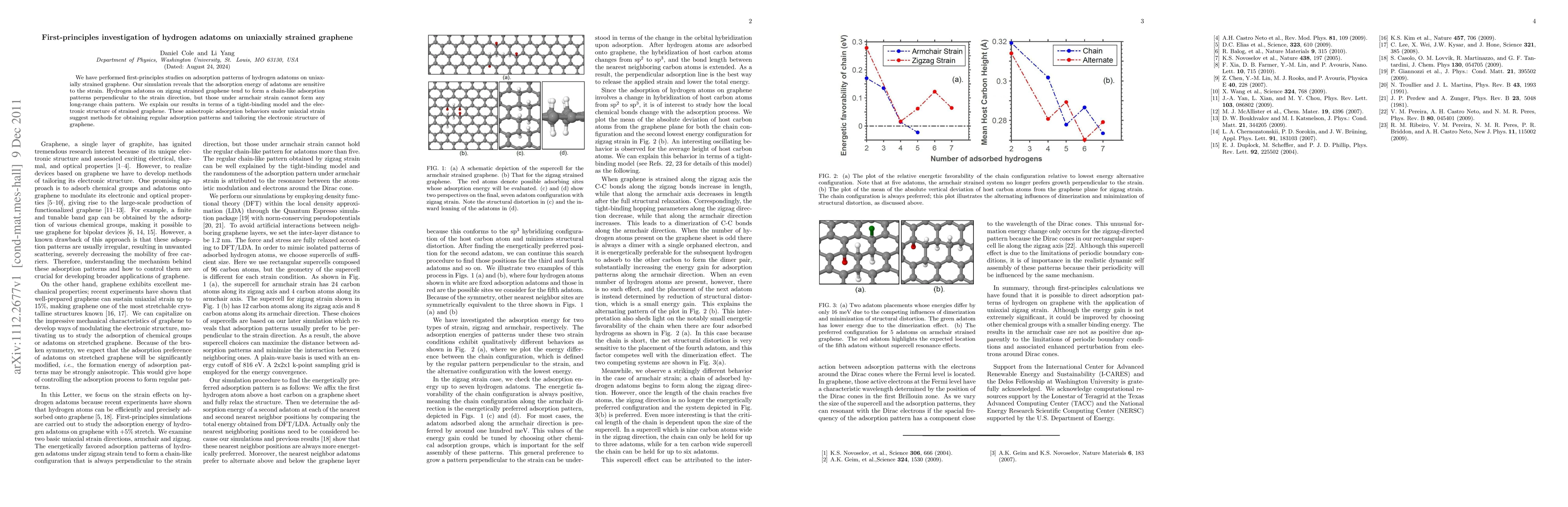 This study investigates hydrogen adatom adsorption on uniaxially strained graphene using first-principles simulations. Adatoms exhibit chain-like patterns perpendicular to zigzag strain but not under armchair strain, highlighting the sensitivity of adsorption energy to strain and potential methods for controlling graphene's electronic structure.