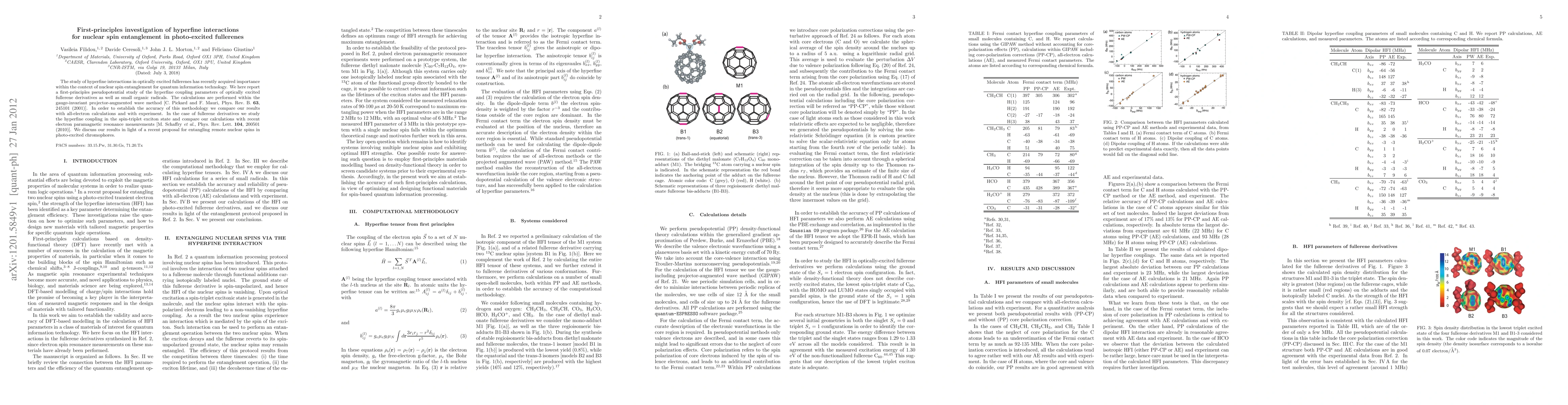 The study of hyperfine interactions in optically excited fullerenes has recently acquired importance within the context of nuclear spin entanglement for quantum information technology. We here report a first-principles pseudopotential study of the hyperfine coupling parameters of optically excited fullerene derivatives as well as small organic radicals. The calculations are performed within the gauge-invariant projector-augmented wave method [C. Pickard and F. Mauri, Phys. Rev. B. 63, 245101 (2001)]. In order to establish the accuracy of this methodology we compare our results with all-electron calculations and with experiment. In the case of fullerene derivatives we study the hyperfine coupling in the spin-triplet exciton state and compare our calculations with recent electron paramagnetic resonance measurements [M. Schaffry et al., Phys. Rev. Lett. 104, 200501 (2010)]. We discuss our results in light of a recent proposal for entangling remote nuclear spins in photo-excited chromophores.