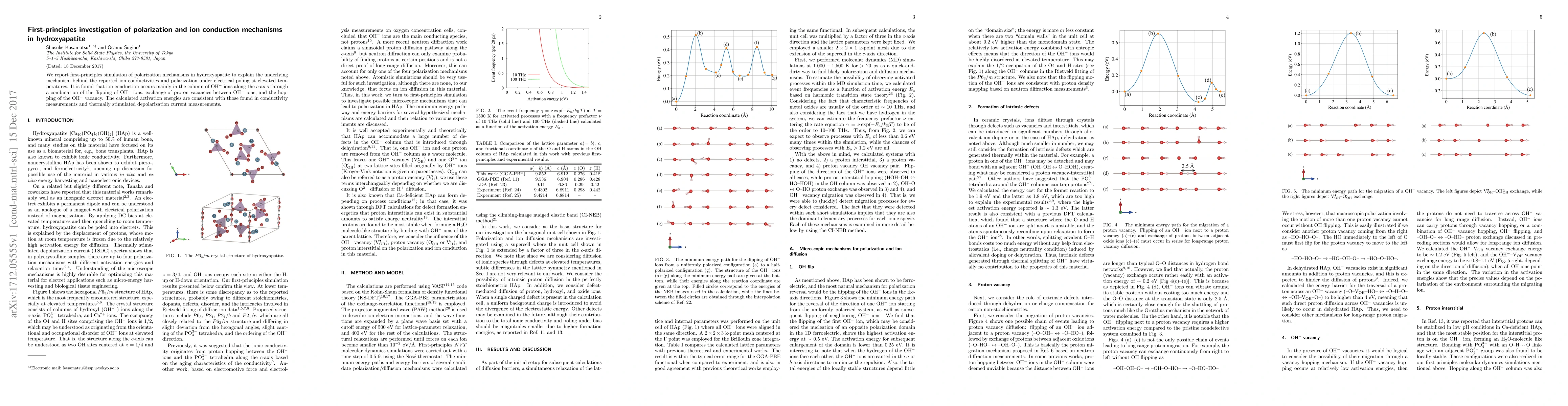 We report first-principles simulation of polarization mechanisms in hydroxyapatite to explain the underlying mechanism behind the reported ion conductivities and polarization under electrical poling at elevated temperatures. It is found that ion conduction occurs mainly in the column of OH$^-$ ions along the $c$-axis through a combination of the flipping of OH$^-$ ions, exchange of proton vacancies between OH$^-$ ions, and the hopping of the OH$^-$ vacancy. The calculated activation energies are consistent with those found in conductivity measurements and thermally stimulated depolarization current measurements.