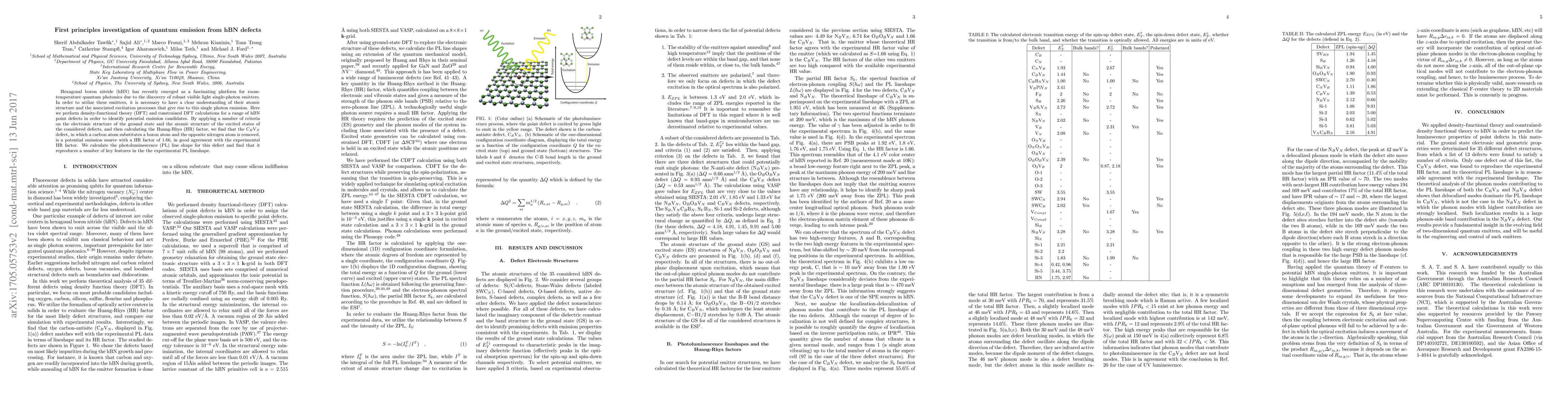 This study uses density-functional theory to investigate quantum emission from various hBN defects, identifying the CBVN defect as a promising single-photon emitter. The calculated Huang-Rhys factor and photoluminescence line shape closely match experimental observations, confirming the defect's potential for room-temperature quantum photonics.