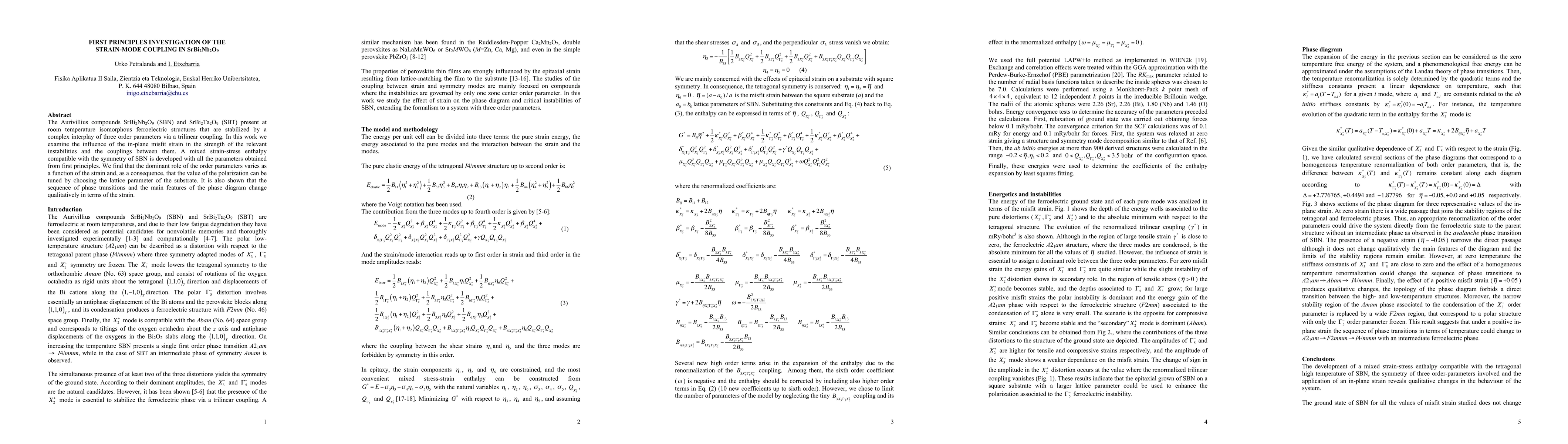 This paper investigates the strain-induced coupling in SrBi2Nb2O9 using first principles calculations, revealing that the strength of the order parameters and phase transitions can be tuned by adjusting the substrate's lattice parameter, thus influencing the polarization and overall phase diagram.