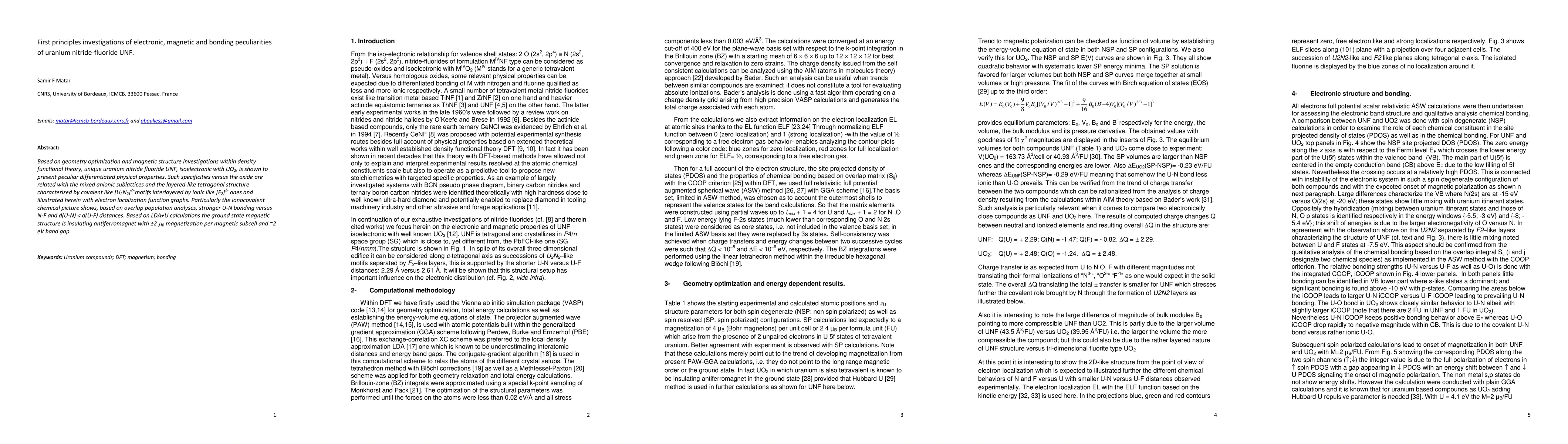 Based on geometry optimization and magnetic structure investigations within density functional theory, unique uranium nitride fluoride UNF, isoelectronic with UO2, is shown to present peculiar differentiated physical properties. Such specificities versus the oxide are related with the mixed anionic sublattices and the layered-like tetragonal structure characterized by covalent like [U2N2]2+motifs interlayered by ionic like [F2]2- ones and illustrated herein with electron localization function graphs. Particularly the ionocovalent chemical picture shows, based on overlap population analyses, stronger U-N bonding versus N-F and d(U-N) < d(U-F) distances. Based on LDA+U calculations the ground state magnetic structure is insulating antiferromagnet with 2 Bohr Magnetons magnetization per magnetic subcell and ~2 eV band gap.