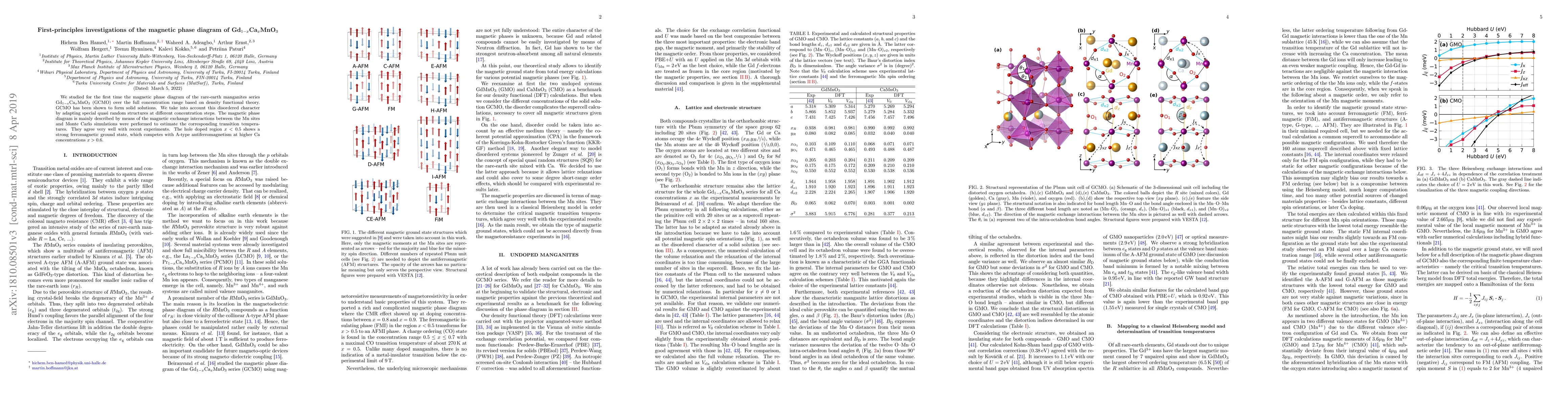 We studied for the first time the magnetic phase diagram of the rare-earth manganites series Gd$_{1-x}$Ca$_{x}$MnO$_{3}$ (GCMO) over the full concentration range based on density functional theory. GCMO has been shown to form solid solutions. We take into account this disordered character by adapting special quasi random structures at different concentration steps. The magnetic phase diagram is mainly described by means of the magnetic exchange interactions between the Mn sites and Monte Carlo simulations were performed to estimate the corresponding transition temperatures. They agree very well with recent experiments. The hole doped region $x<0.5$ shows a strong ferromagnetic ground state, which competes with A-type antiferromagnetism at higher Ca concentrations $x>0.6$.