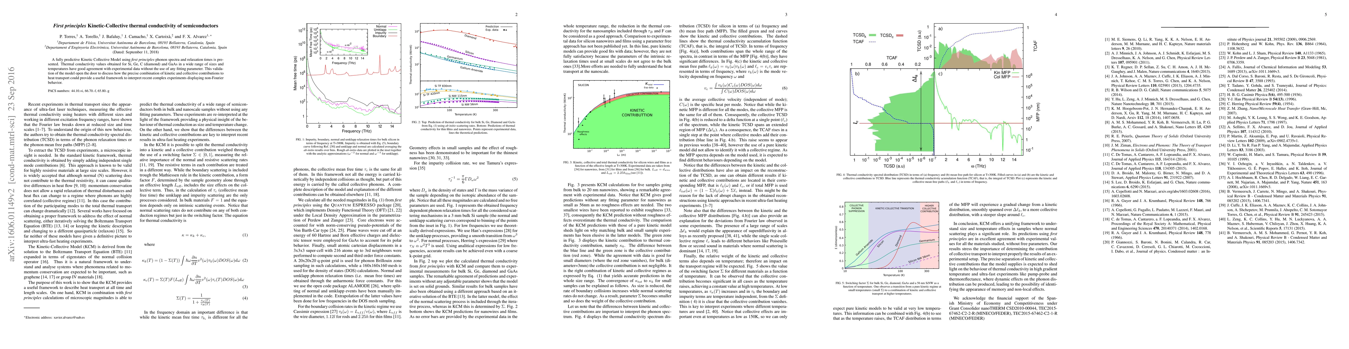 A fully predictive Kinetic Collective Model using first principles phonon spectra and relaxation times is presented. Thermal conductivity values obtained for Si, Ge, C (diamond) and GaAs in a wide range of sizes and temperatures have good agreement with experimental data without the use of any fitting parameter. This validation of the model open the door to discuss how the precise combination of kinetic and collective contributions to heat transport could provide a useful framework to interpret recent complex experiments displaying non-Fourier behavior.