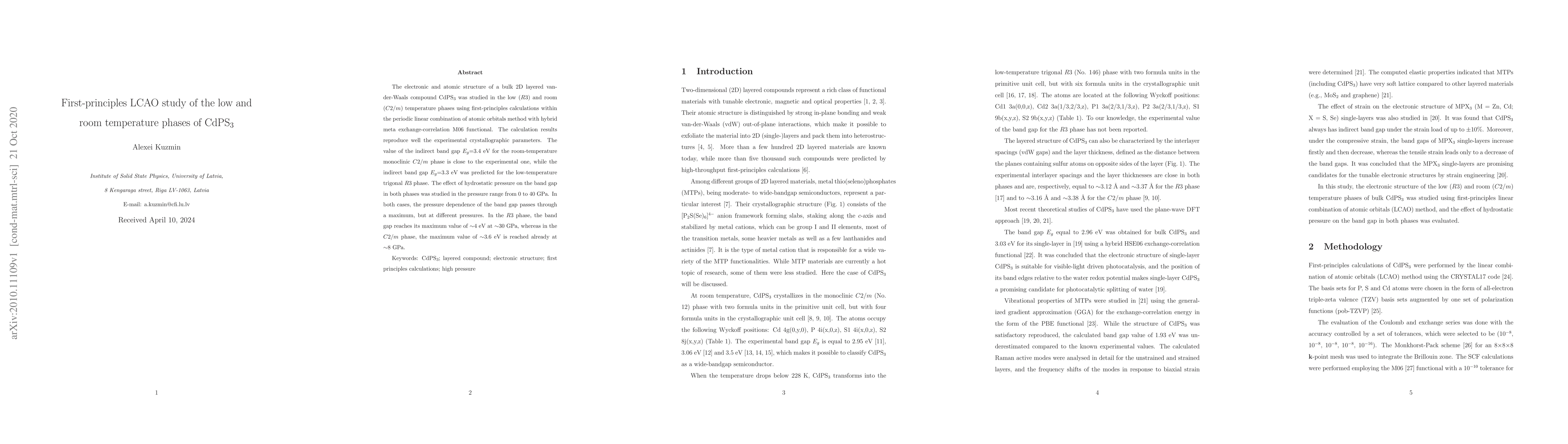 Researchers used first-principles calculations to study the electronic structure of CdPS3 in its low-temperature and room-temperature phases, finding that hydrostatic pressure increases the band gap in both phases with different maxima at 30GPa and 8GPa respectively.