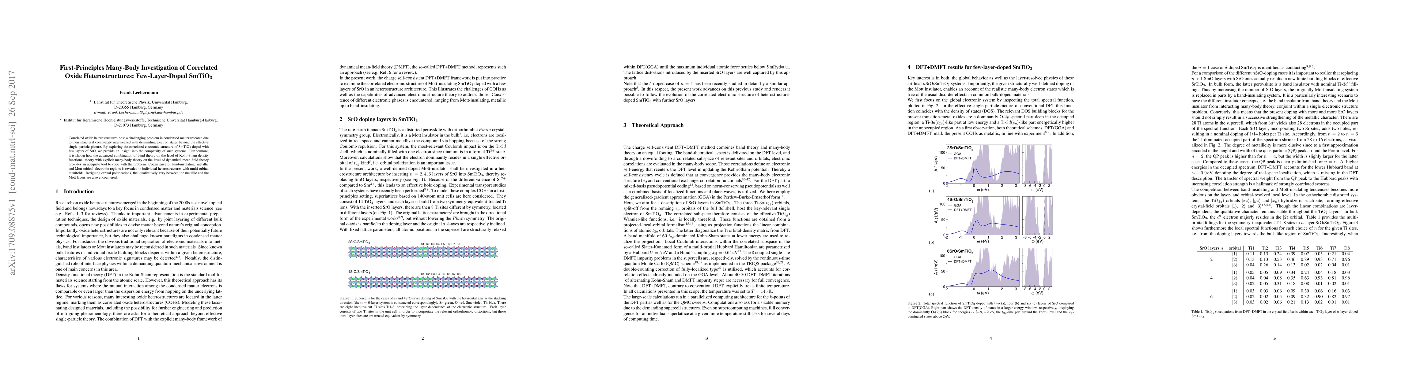 Correlated oxide heterostructures pose a challenging problem in condensed matter research due to their structural complexity interweaved with demanding electron states beyond the effective single-particle picture. By exploring the correlated electronic structure of SmTiO$_3$ doped with few layers of SrO, we provide an insight into the complexity of such systems. Furthermore, it is shown how the advanced combination of band theory on the level of Kohn-Sham density functional theory with explicit many-body theory on the level of dynamical mean-field theory provides an adequate tool to cope with the problem. Coexistence of band-insulating, metallic and Mott-critical electronic regions is revealed in individual heterostructures with multi-orbital manifolds. Intriguing orbital polarizations, that qualitatively vary between the metallic and the Mott layers are also encountered.