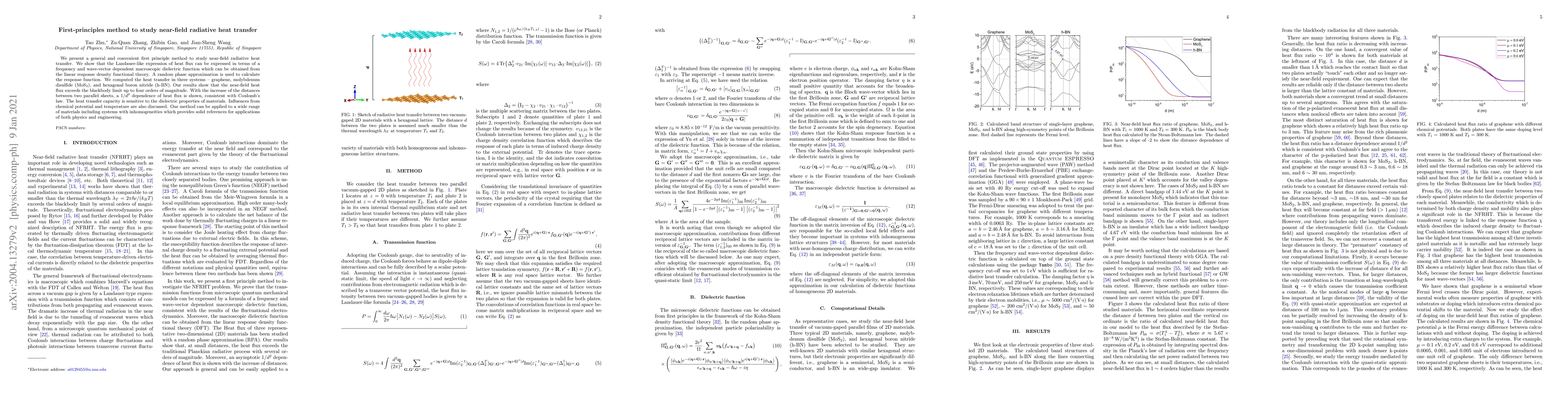 This paper introduces a first-principles method to study near-field radiative heat transfer, demonstrating that the heat flux can be expressed via a dielectric function derived from linear response density functional theory. The method reveals that near-field heat transfer in materials like graphene, MoS$_2$, and h-BN can exceed the blackbody limit by four orders of magnitude, with a $1/d^2$ dependence on distance.