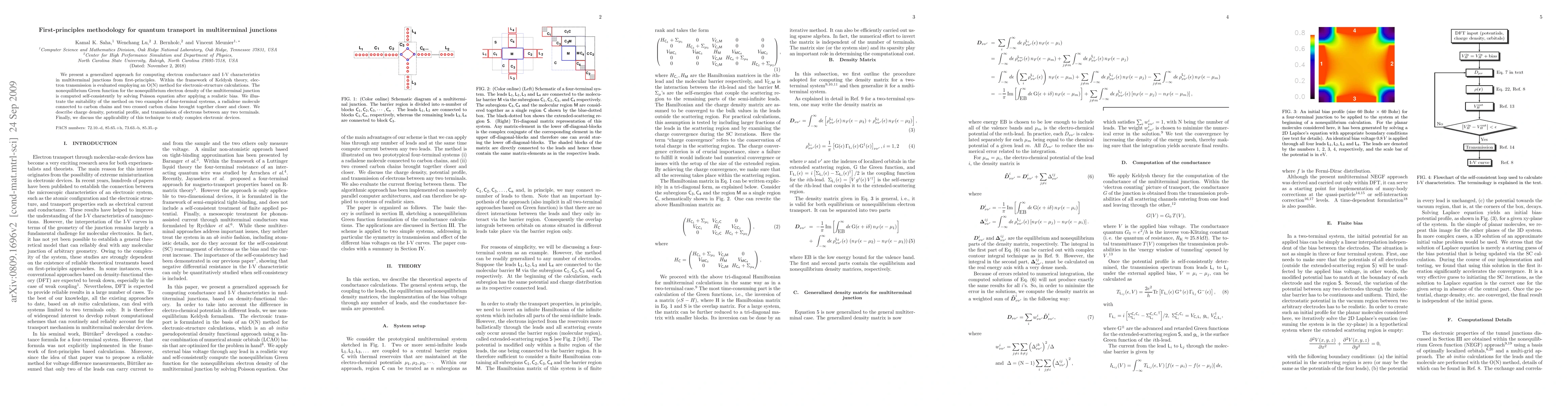 We present a generalized approach for computing electron conductance and I-V characteristics in multiterminal junctions from first-principles. Within the framework of Keldysh theory, electron transmission is evaluated employing an O(N) method for electronic-structure calculations. The nonequilibrium Green function for the nonequilibrium electron density of the multiterminal junction is computed self-consistently by solving Poisson equation after applying a realistic bias. We illustrate the suitability of the method on two examples of four-terminal systems, a radialene molecule connected to carbon chains and two crossed carbon chains brought together closer and closer. We describe charge density, potential profile, and transmission of electrons between any two terminals. Finally, we discuss the applicability of this technique to study complex electronic devices.