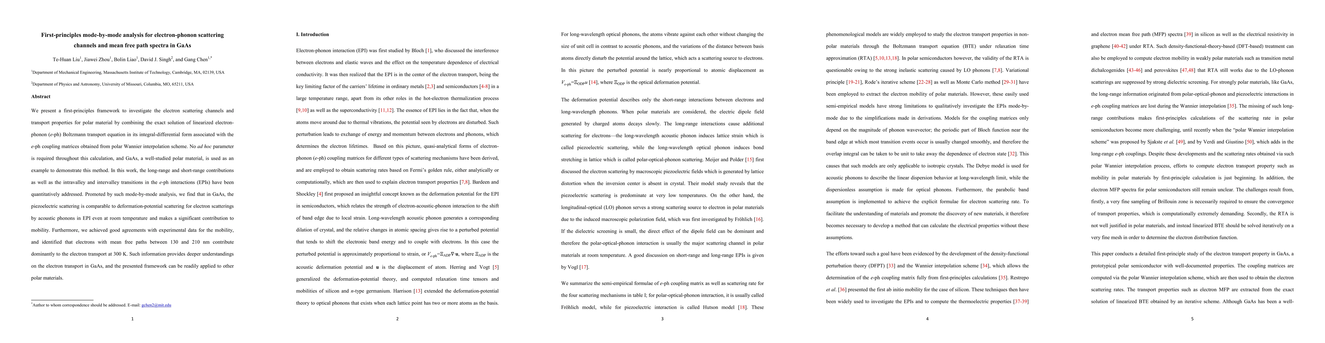 This paper introduces a first-principles method to analyze electron-phonon scattering channels in GaAs, revealing that piezoelectric scattering is significant at room temperature and contributes to mobility. The study identifies electrons with mean free paths of 130-210 nm as the primary carriers for transport at 300 K, providing insights into electron transport in GaAs and a framework applicable to other polar materials.