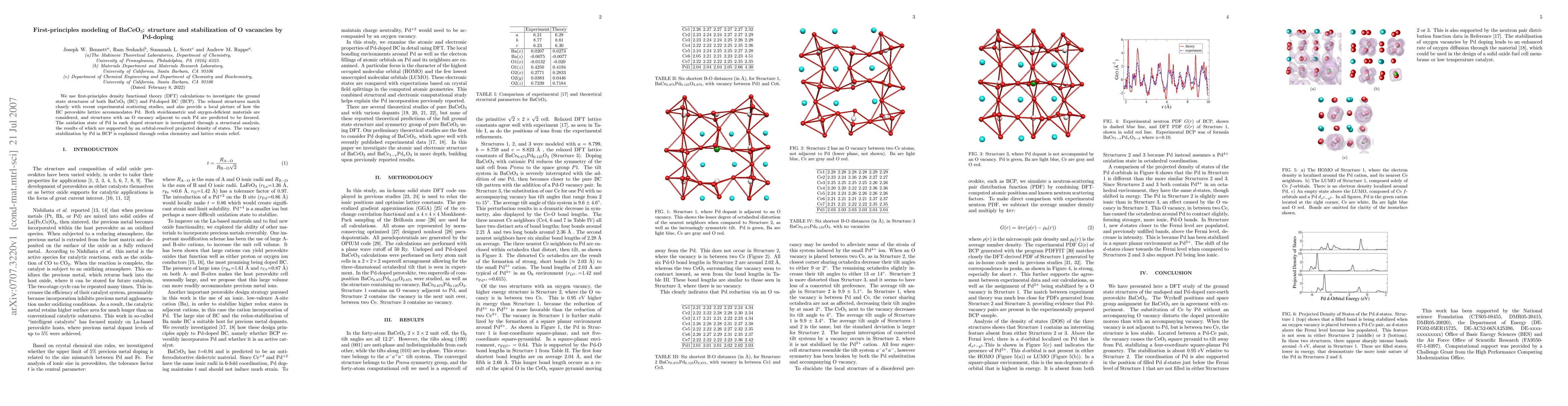 We use first-principles density functional theory (DFT) calculations to investigate the ground state structures of both BaCeO_{3} (BC) and Pd-doped BC (BCP). The relaxed structures match closely with recent experimental scattering studies, and also provide a local picture of how the BC perovskite lattice accommodates Pd. Both stoichiometric and oxygen-deficient materials are considered, and structures with an O vacancy adjacent to each Pd are predicted to be favored. The oxidation state of Pd in each doped structure is investigated through a structural analysis, the results of which are supported by an orbital-resolved projected density of states. The vacancy stabilization by Pd in BCP is explained through redox chemistry and lattice strain relief.