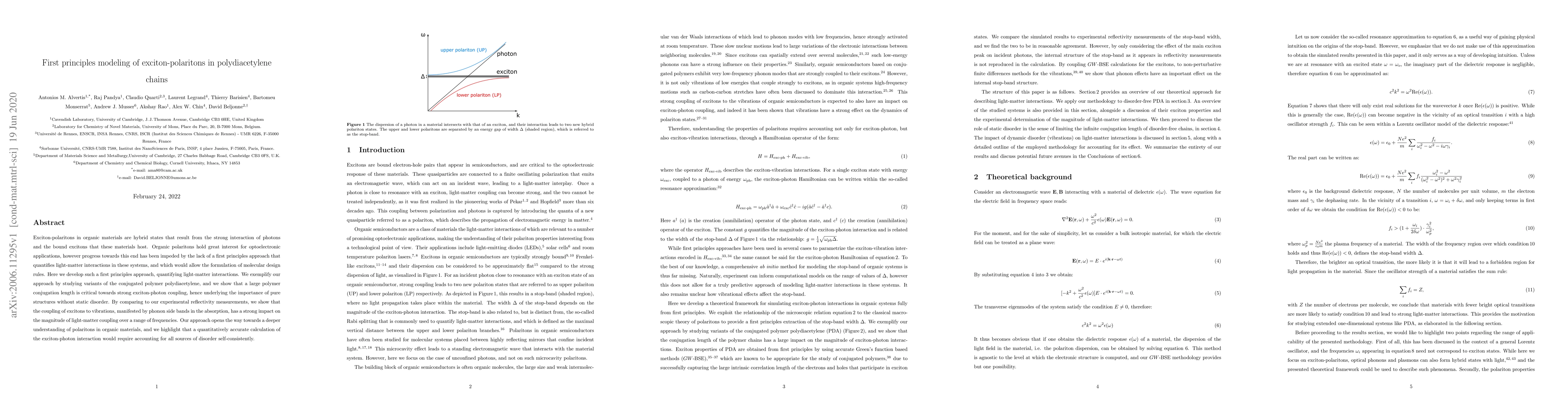 This paper develops a first principles modeling approach to quantify light-matter interactions in exciton-polaritons within polydiacetylene chains, emphasizing the importance of polymer conjugation length and structural purity for strong exciton-photon coupling. The study reveals that phonon side bands significantly influence the coupling magnitude, paving the way for better optoelectronic applications in organic materials.