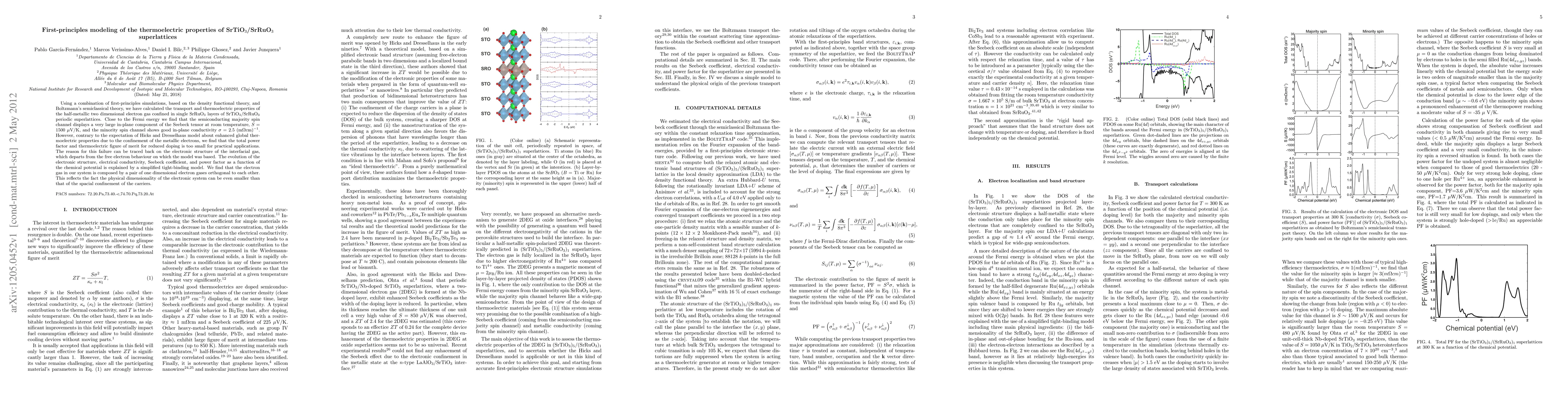 This paper uses first-principles simulations to study the thermoelectric properties of SrTiO$_3$/SrRuO$_3$ superlattices, finding a large in-plane Seebeck tensor and good conductivity in the minority spin channel. However, contrary to expectations, the thermoelectric figure of merit is too low for practical use due to the deviation of the interfacial electron gas from free electron behavior.