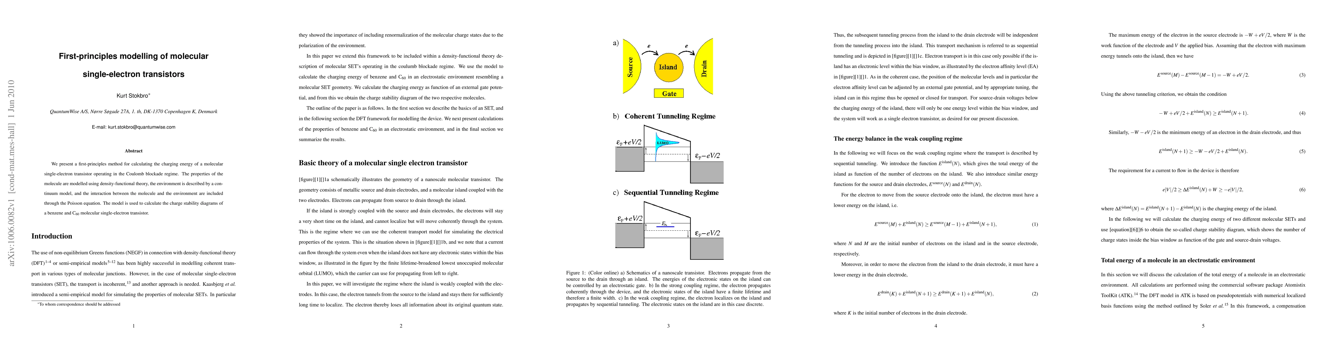 We present a first-principles method for calculating the charging energy of a molecular single-electron transistor operating in the Coulomb blockade regime. The properties of the molecule are modeled using density-functional theory, the environment is described by a continuum model, and the interaction between the molecule and the environment are included through the Poisson equation. The model is used to calculate the charge stability diagrams of a benzene and C$_{60}$ molecular single-electron transistor.