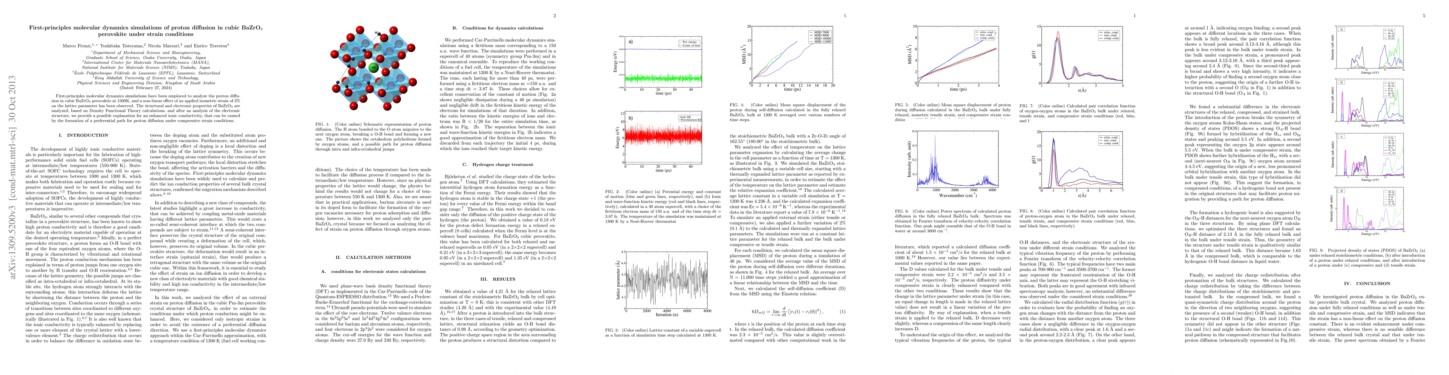 First-principles molecular dynamics simulations have been employed to analyze the proton diffusion in cubic BaZrO3 perovskite at 1300K, and a non-linear effect of an applied isometric strain of 2% on the lattice parameter has been observed. The structural and electronic properties of BaZrO3 are analyzed, based on Density Functional Theory calculations, and after an analysis of the electronic structure, we provide a possible explanation for an enhanced ionic conductivity, that can be caused by the formation of a preferential path for proton diffusion under compressive strain conditions.