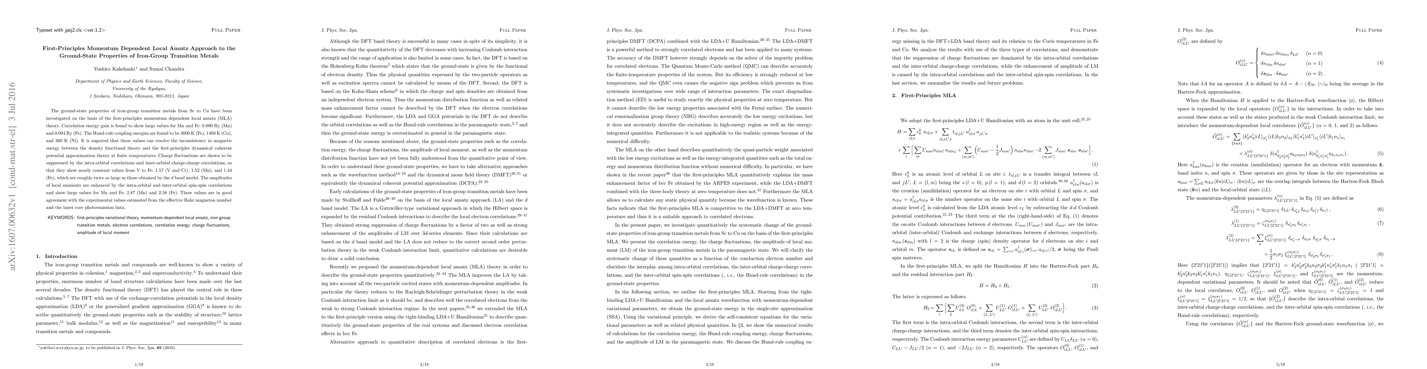The ground-state properties of iron-group transition metals from Sc to Cu have been investigated on the basis of the first-principles momentum dependent local ansatz (MLA) theory. Correlation energy gain is found to show large values for Mn and Fe: 0.090 Ry (Mn) and 0.094 Ry (Fe). The Hund-rule coupling energies are found to be 3000 K (Fe), 1400 K (Co), and 300 K (Ni). It is sugested that these values can resolve the inconsistency in magnetic energy between the density functional theory and the first-principles dynamical coherent potential approximation theory at finite temperatures. Charge fluctuations are shown to be suppressed by the intra-orbital correlations and inter-orbital charge-charge correlations, so that they show nearly constant values from V to Fe: 1.57 (V and Cr), 1.52 (Mn), and 1.44 (Fe), which are roughly twice as large as those obtained by the $d$ band model. The amplitudes of local moments are enhanced by the intra-orbital and inter-orbital spin-spin correlations and show large values for Mn and Fe: 2.87 (Mn) and 2.58 (Fe). These values are in good agreement with the experimental values estimated from the effective Bohr magneton number and the inner core photoemission data.
