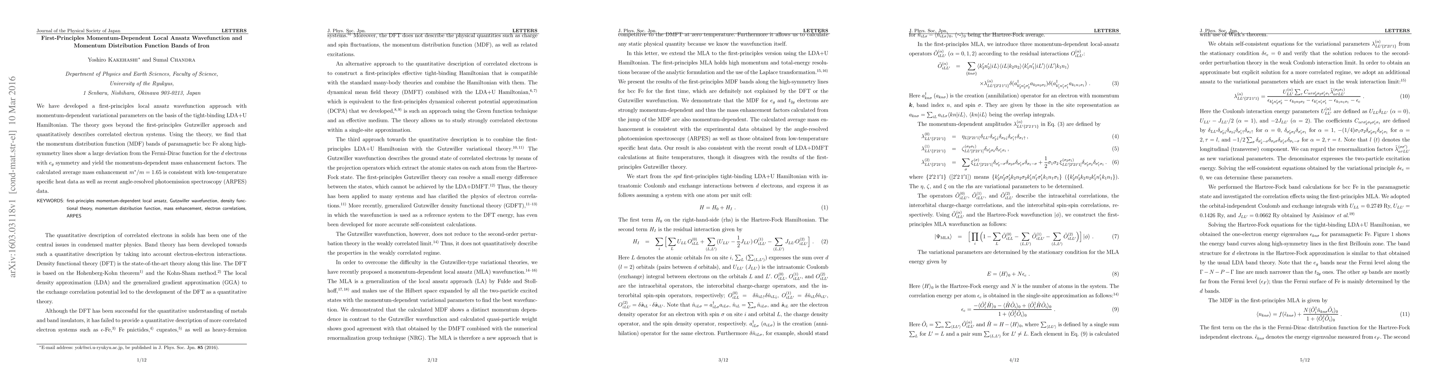 We have developed a first-principles local ansatz wavefunction approach with momentum-dependent variational parameters on the basis of the tight-binding LDA+U Hamiltonian. The theory goes beyond the first-principles Gutzwiller approach and quantitatively describes correlated electron systems. Using the theory, we find that the momentum distribution function (MDF) bands of paramagnetic bcc Fe along high-symmetry lines show a large deviation from the Fermi-Dirac function for the $d$ electrons with $e_{g}$ symmetry and yield the momentum-dependent mass enhancement factors. The calculated average mass enhancement $m^{\ast}/m = 1.65$ is consistent with low-temperature specific heat data as well as recent angle-resolved photoemission spectroscopy (ARPES) data.